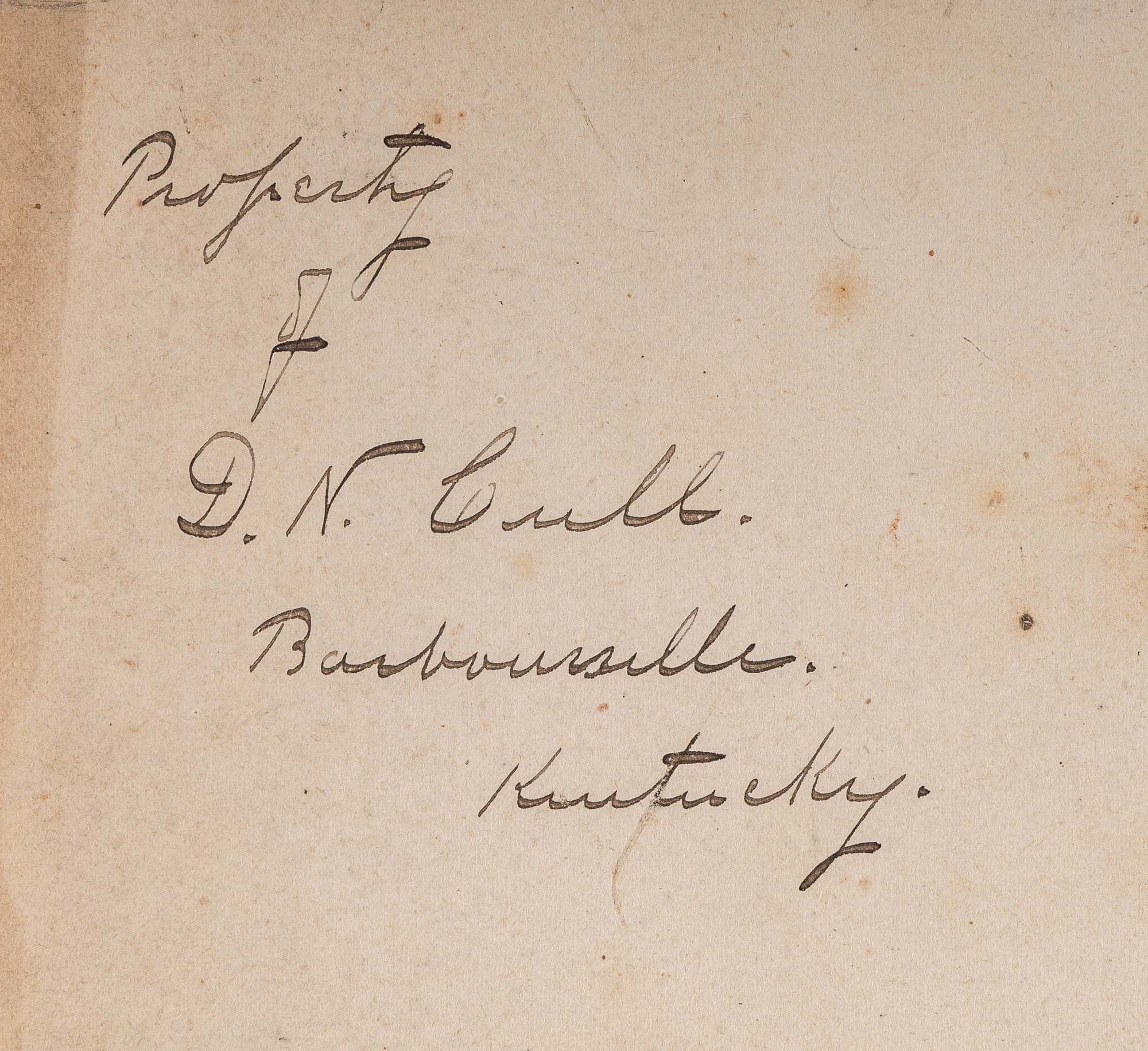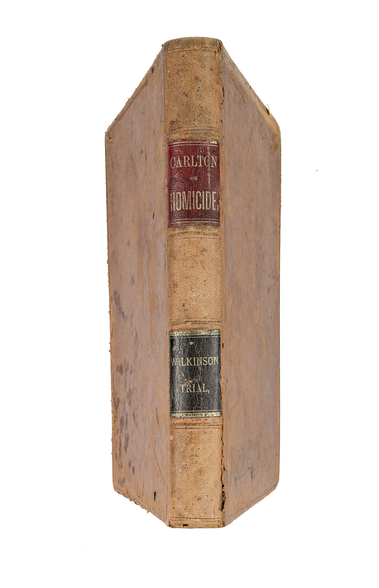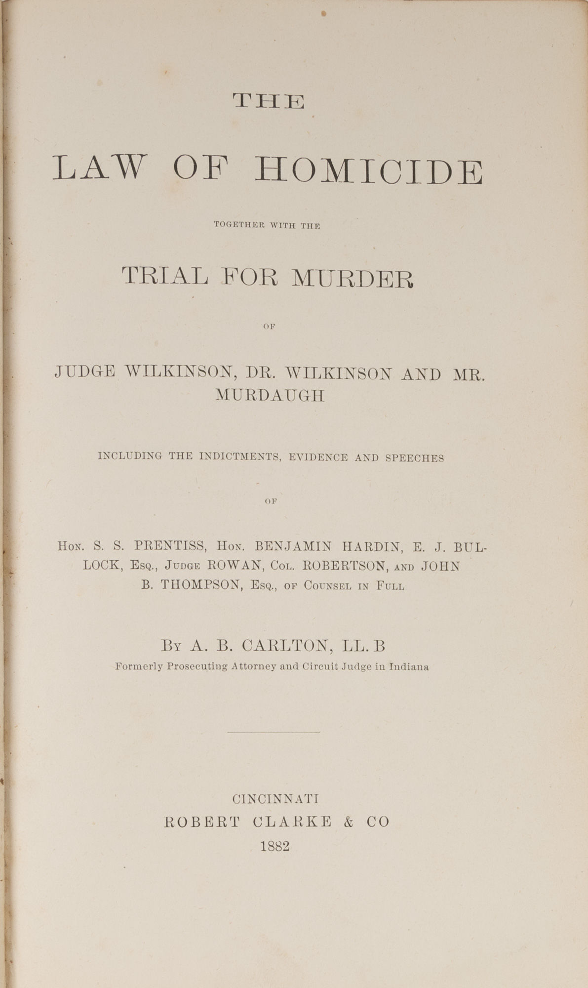 1882. Cincinnati: Robert Clarke & Co., 1882. Cincinnati: Robert Clarke & Co., 1882. Account of a Kentucky Case that Explores the American Law of Homicide, This Copy Owned by a Notably Kentucky Judge Carlton, A[mbrose] B[olivar] [1825-1901]. The Law of Homicide, Together with the Trial for Murder of Judge Wilkinson, Dr. Wilkinson and Mr. Murdaugh, Including the Indictments, Evidence and Speeches of Hon. S.S. Prentiss, Hon. Benjamin Hardin, E.J. Bullock, Esq., Judge Rowan, Col. Robertson, And John B. Thompson, Esq., Of Counsel in Full. Cincinnati: Robert Clarke & Co., 1882. 412 pp. Octavo (9" x 5-1/2"). Contemporary sheep, blind frames to boards, raised bands and red and black lettering pieces to spine. Light rubbing to boards, minor worming to rear board, moderate rubbing to extremities, front joint starting at foot, corners bumped and lightly worn, hinges cracked, "Property/ of/ D.N. Cull,/ Barbourville,/ Kentucky" to front pastedown, later owner bookseller stamp of Benjamin A. Maslan to rear pastedown, moderate toning to interior. $250. * Only edition. Carlton uses a detailed examination of a notable Louisville, Kentucky case, which involved a dispute that ended in two murders committed in the name of "honor," to illustrate the principal features of the American law of homicide. Newspapers.com and Ancestry.com identifies D.N. Cull as Daniel N. Cull [b.1844], a Kentucky judge. He became nationally famous in 1889 for his personal role, while a sitting judge, in the defeat of a criminal gang as the member of a posse. Benjamin A. Maslan [1901-1979] was a prominent Seattle attorney and bibliophile who created an important collection of Bibles that was later donated to the American Jewish University, Los Angeles. See McDade, The Annals of Murder 1094 (summary of case). Catalogue of the Library of the Harvard Law School (1909) I:337.