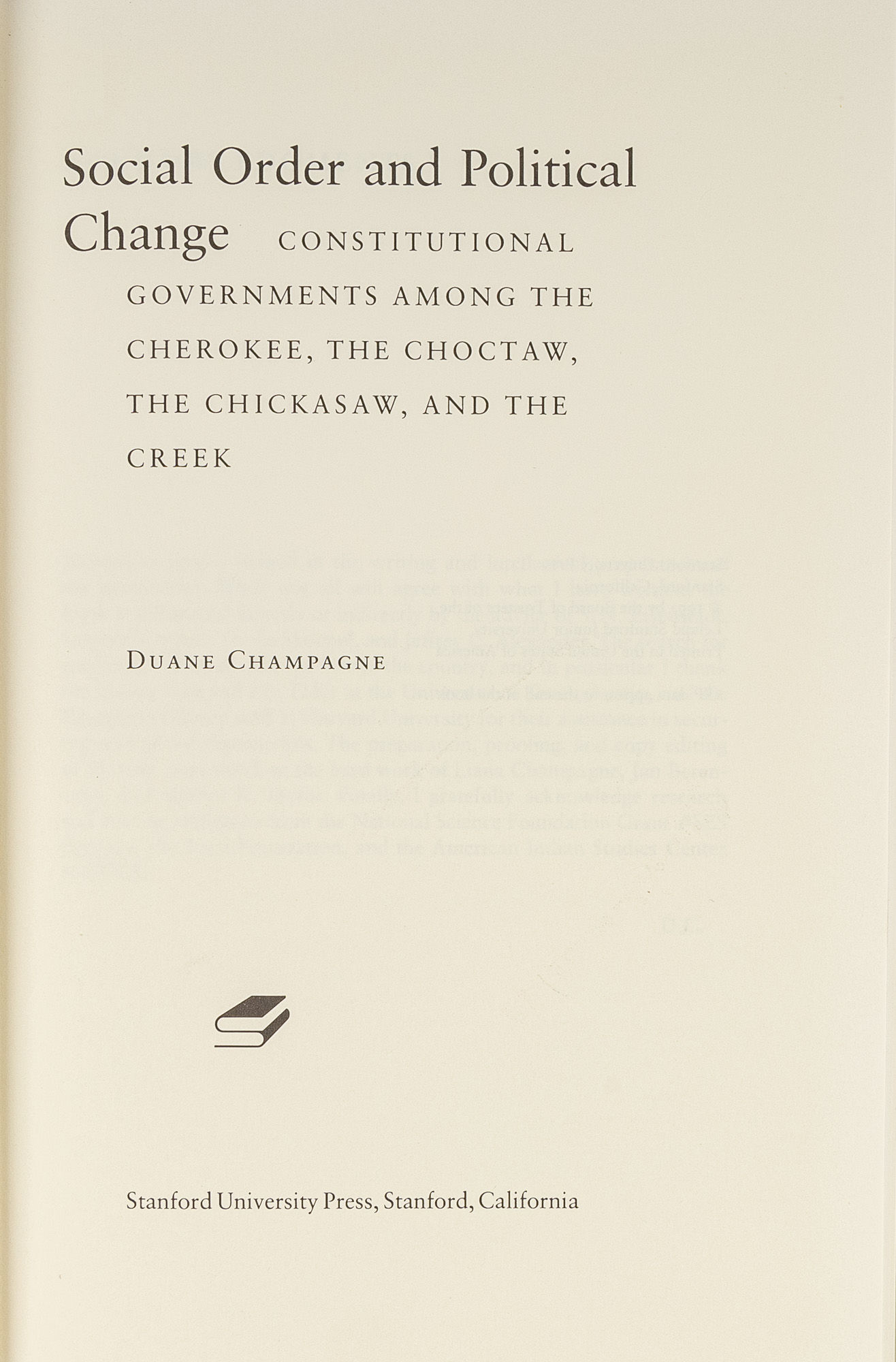 1992. Champagne, Duane. Social Order and Political Change: Constitutional Governments Among the Cherokee, the Choctaw, the Chickasaw, and the Creek. Stanford, CA: Stanford University Press, 1992. 317 pp. Publisher's original green cloth, with gilt stamped spine. Near fine, in a near fine dust jacket. $95. * Under what conditions can democratic governments be formed and become stable? The author addresses this question in a unique way that brings sociological and political theory to bear on the study of traditional societies, long the preserve of historians and anthropologists. By examining in detail the history of four American Indian societies--the Cherokee, the Choctaw, the Chickasaw, and the Creek--the author documents a general theory of politics and constitutional government. The four societies present an opportunity to study the process of democratic institution building in a controlled, comparative historical context. The societies were subject to similar geopolitical relations with the United States; they were incorporated into the same sequence of world economic system relations (initially fur trade and then the cotton market); they experienced the emergence of class structures; and they all produced some form of constitutional democracy. The Cherokee, however, adopted a stable constitutional government earlier and with less coercion than the other three nations. Why was this so? With the aid of comparative analysis, the author finds the answer in the Cherokee differentiation of politics from the nationally and religiously ordered clan system. This set of institutional relations allowed the Cherokee to maintain a strong sense of social solidarity while tolerating conflict, increased political differentiation, and formation of a political nationality. The other three societies were either less differentiated or less socially unified. They formed their constitutional governments thirty to forty years later than the Cherokee and with more internal political coercion--and, in the Creek case, with less political stability. The formation and stabilization of democratic state governments is a major issue in such contemporary phenomena as political change in Third World nations and the transformation of the governments of Eastern Europe. The four case studies presented in this hook form the basis of a new and powerful theoretical arg.