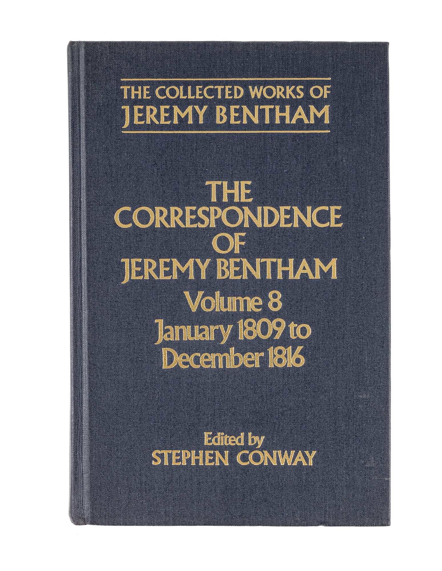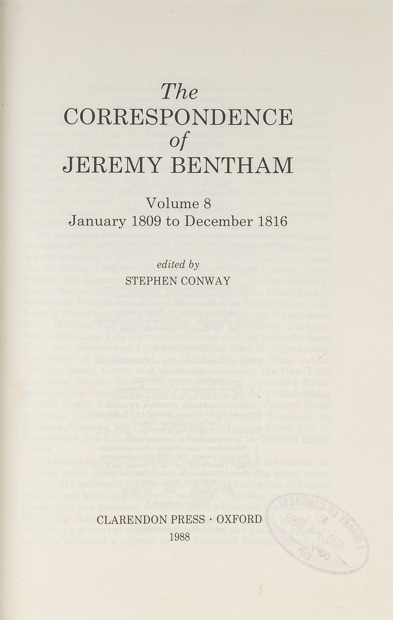 1988. Bentham, Jeremy; Conway, Stephen. The Correspondence of Jeremy Bentham: Volume 8, January 1809 to December 1816. Oxford: Clarendon Press, 1988. xxxix, 587 pp. Original cloth with gilt stamped spine and boards, light shelfwear. Ex-library with property stamps to half title, title, and copyright pages. Else very good. $35. * From the authoritative Bentham Project of the Faculty of Laws, University College London, which has published 27 volumes.