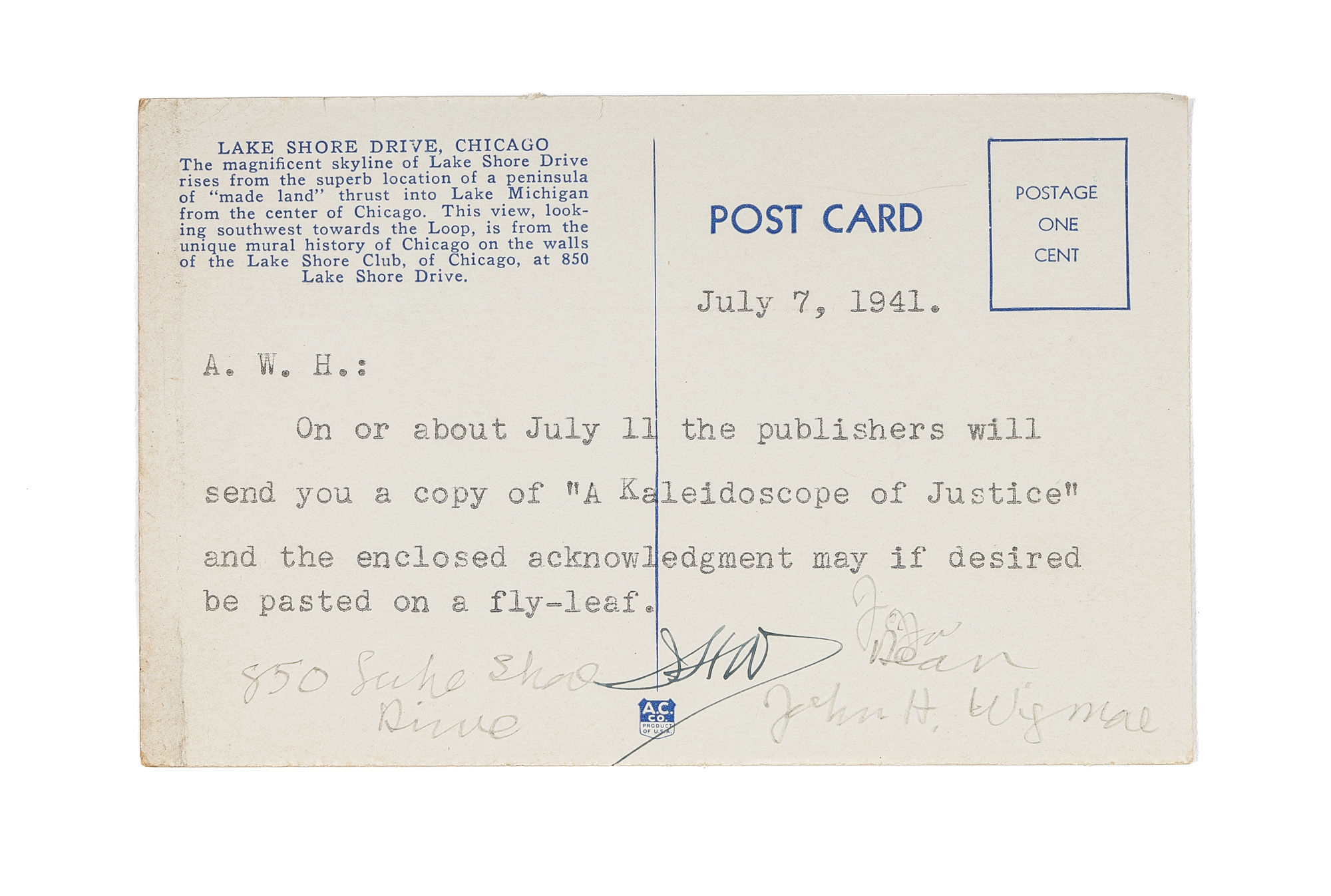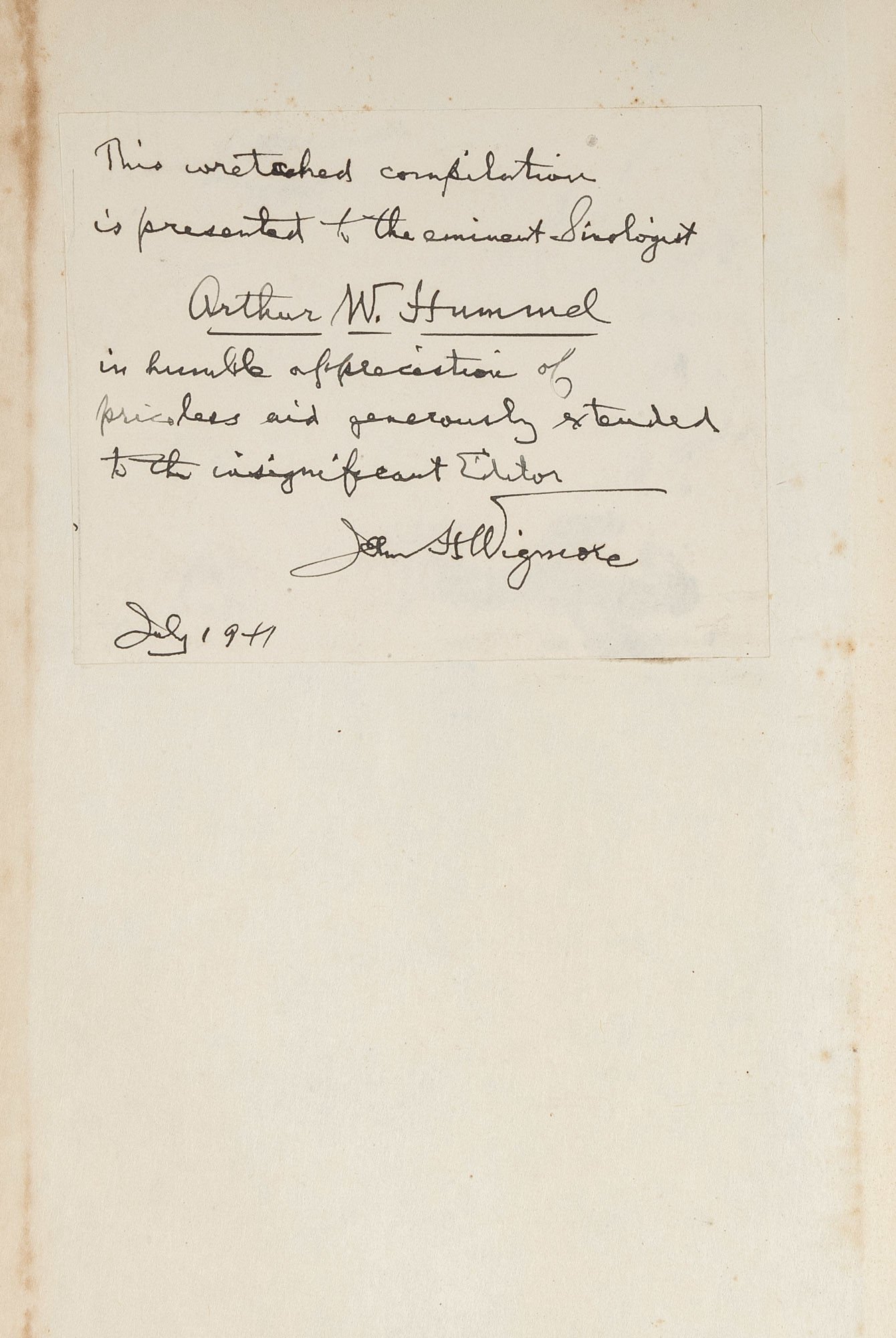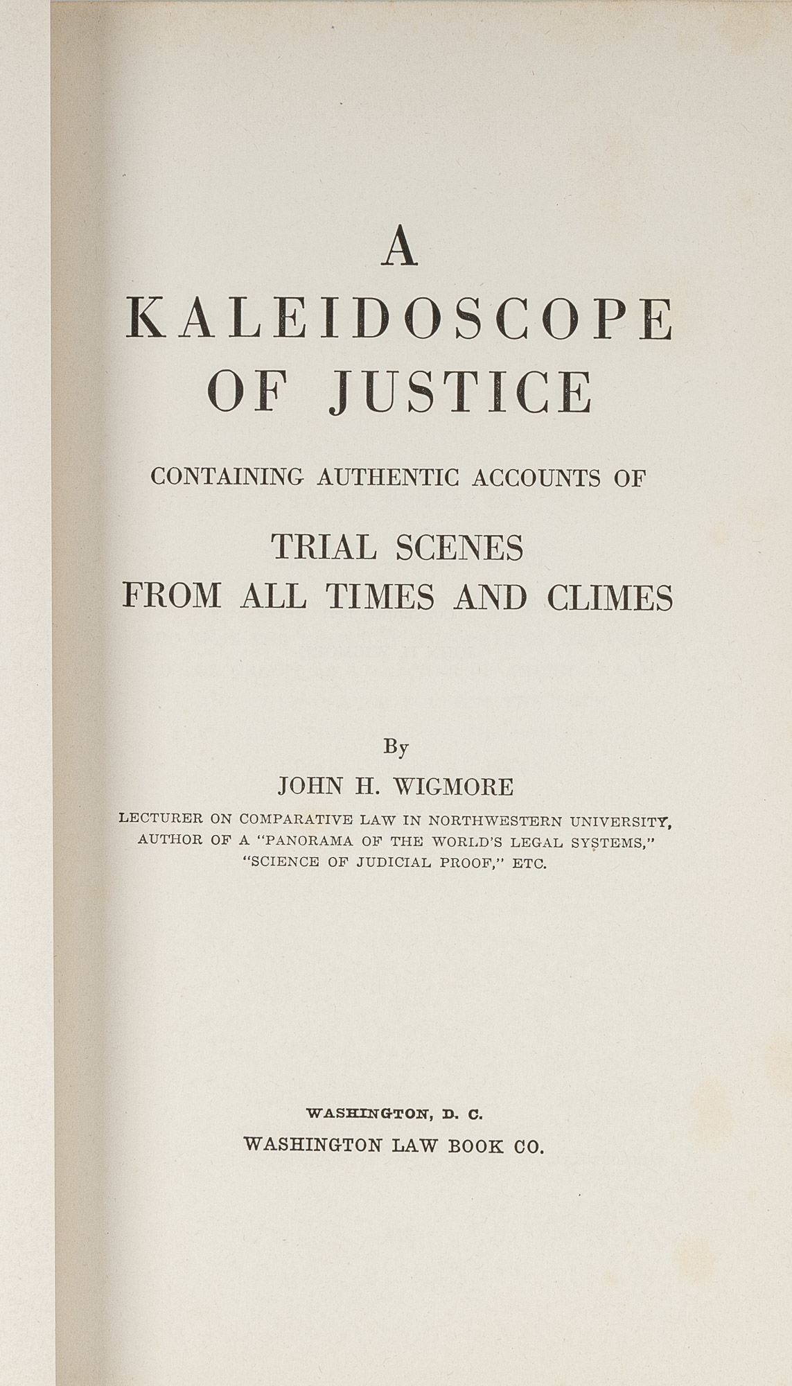 1941. Inscribed by Wigmore to Arthur William Hummel Sr.. Inscribed by Wigmore to Arthur William Hummel Sr. Inscribed by the Author John H. Wigmore Wigmore, John H. [1863-1943] A Kaleidoscope of Justice: Containing Authentic Accounts of Trial Scenes from All Times and Crimes. Washington, DC: Washington Law Book Co., 1941. xxx, 751 pp. 1 folded leaf of plates with color illustrations. Publisher's cloth, gilt stamped spine and front cover. Light dampspotting to boards. Author's presentation inscription to front pastedown: "This wretched compilation/ is presented to the eminent Sinologist/ Arthur W. Hummel/ in humble appreciation of/ priceless aid generously extended/ to the insignificant Editor/ John H. Wigmore/ July 1941." $350. * Though perhaps best known for his scholarship on evidence in Anglo-American law, Wigmore also taught law at Tokyo's Keio University from 1889-1892. He later became Northwestern Law School's first full-time dean. Arthur W. Hummel Sr. [1884-1975], a prominent American sinologist and missionary, was the first president of the Association for Asian Studies.