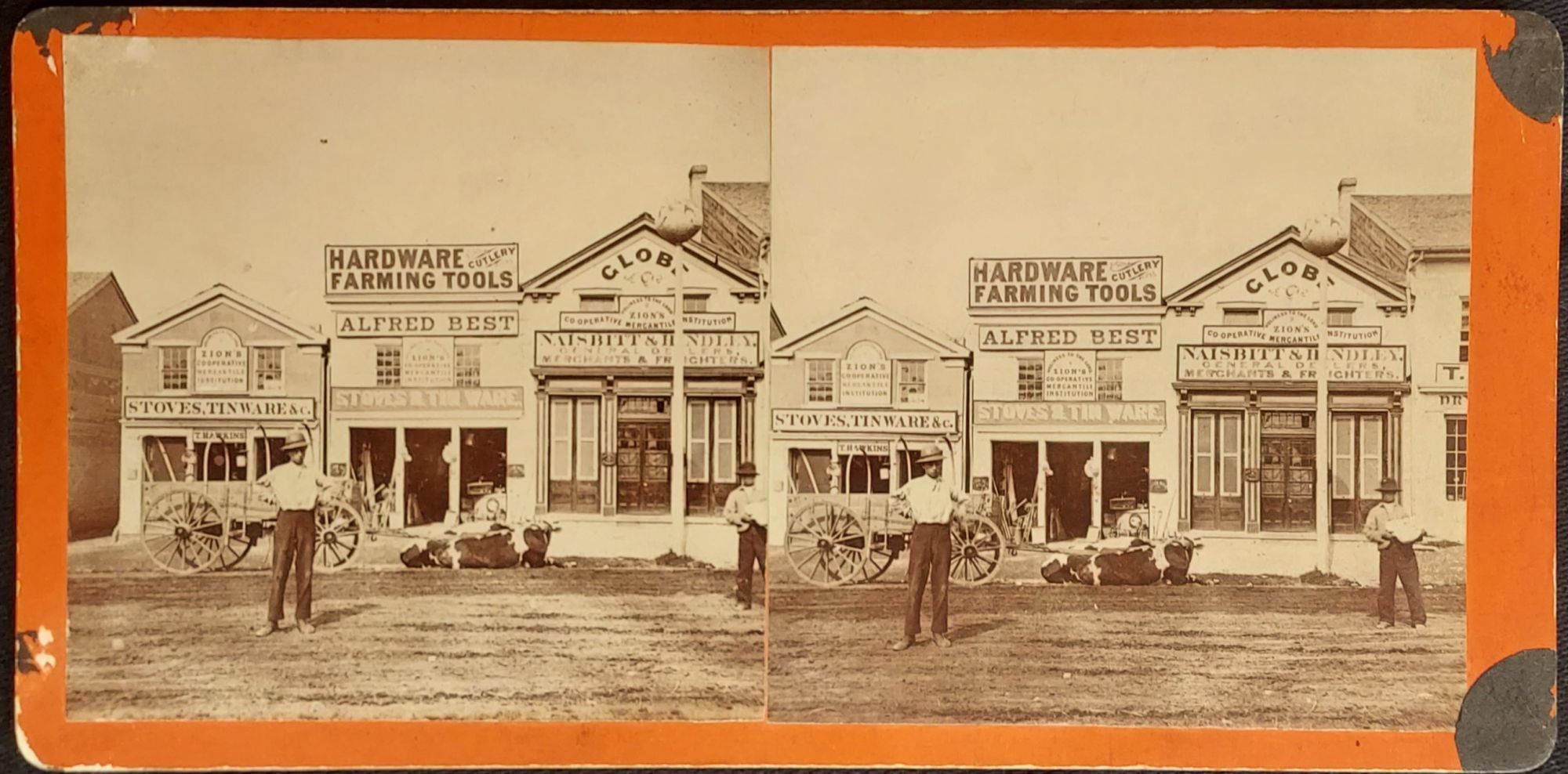 Salt Lake City, UT. Photograph. Very good minus. Stereoview [17.5 cm x 8.5 cm] on orange mount. C. W. Carter's View Emporium backstamp. Corners with black paper residue. In pencil on the reverse: "3 Z.C.M.I. stores" and "W. side E Temple 1st & 2nd." Also present, is a brief notation in pencil which has been crossed out, and two minor numerical notations. A sharp image. Englishman Charles William Carter (1832-1918), one of Utah's early photographers, spent nearly three decades photo-documenting Mormon life. He is well known for his photographs of the construction of the Church of Jesus Christ of Latter-day Saints Temple and Tabernacle.