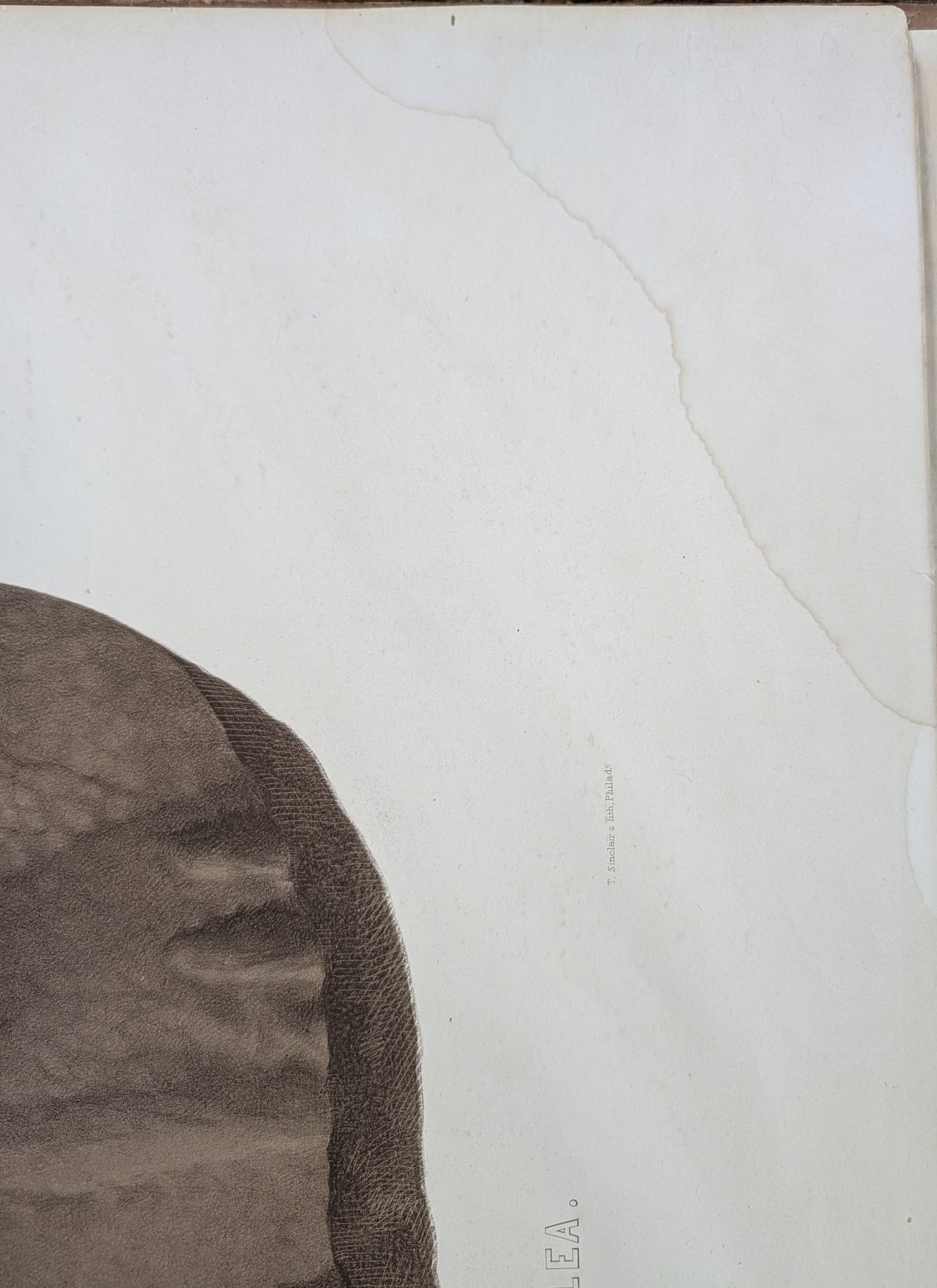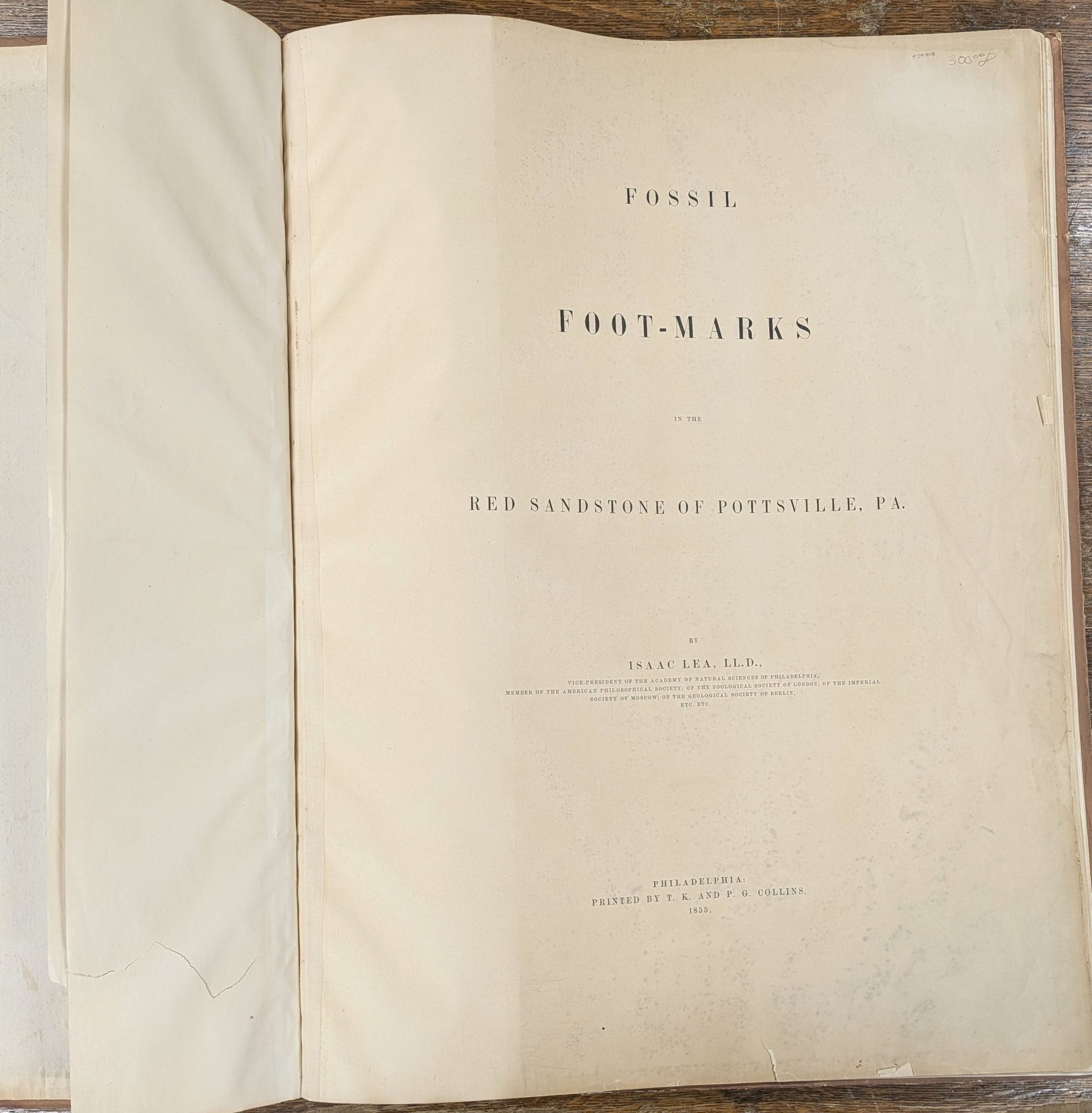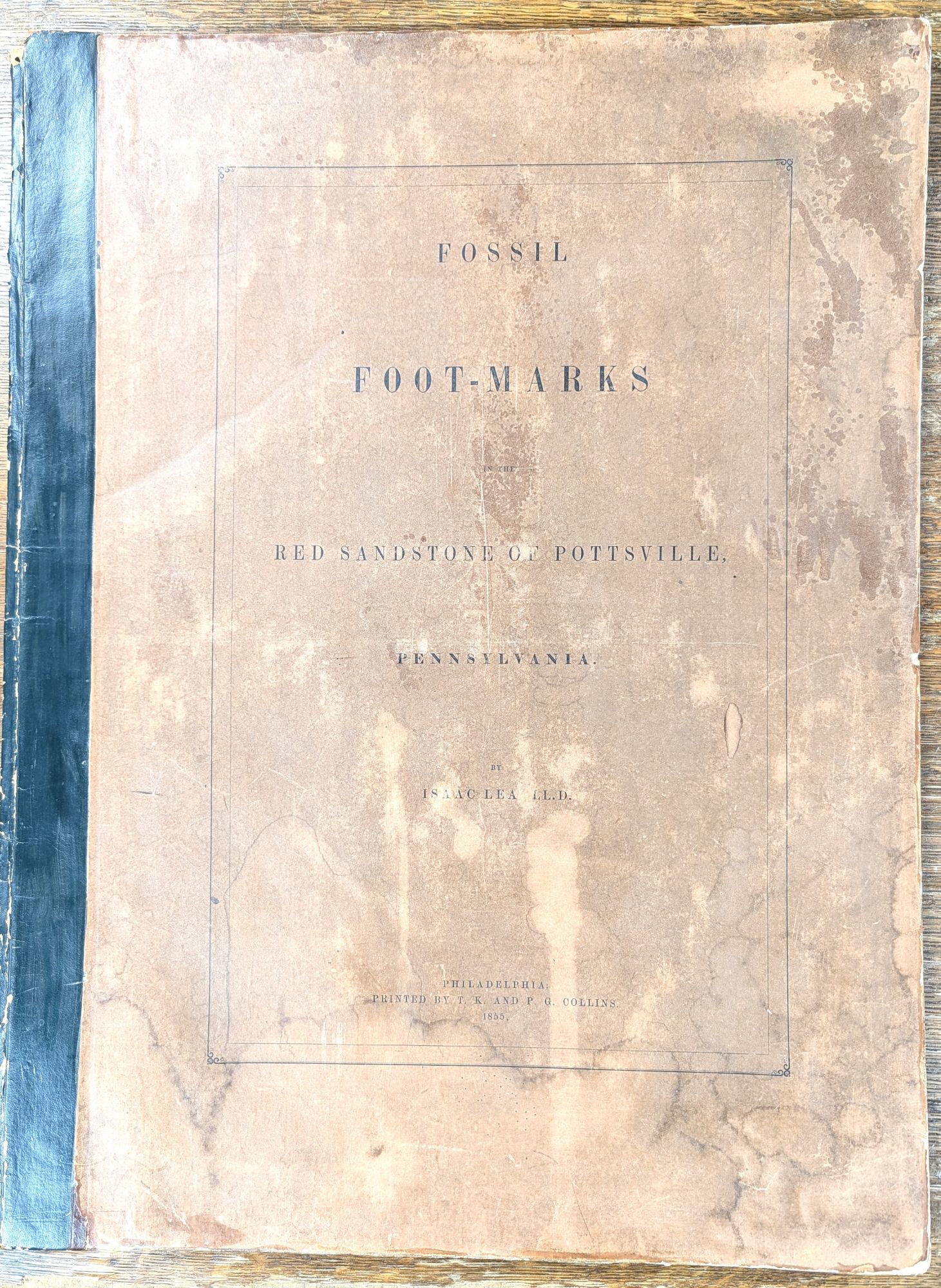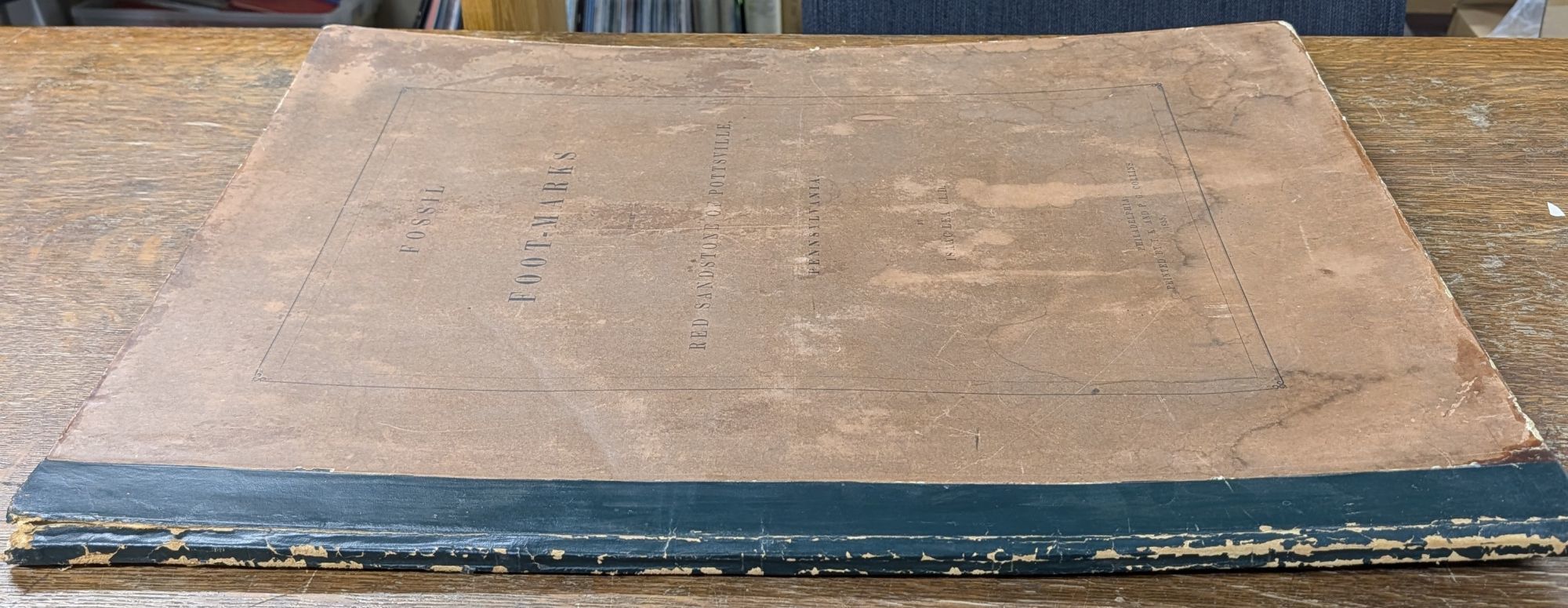 Philadelphia: Printed by T.K. and P.G. Collins, 1855. Hardcover. Good. 16pp. Elephant folio [70 cm] Publisher's quarter leather over tan printed boards. Overall discoloring and age toning to boards. Rubbing to the extremities (more so to the backstrip and rear board). Some subtle dampstaining to the boards and the edges of the large plate, which is present at the rear. Plate is titled 'Sauropus Primaevus, Lea. with ripple marks and rain drop pits' At the time that Lea named 'Sauropus Primaevus' they were the then oldest vertebrate footprints reported. An uncommon work by the geologist and businessmen.