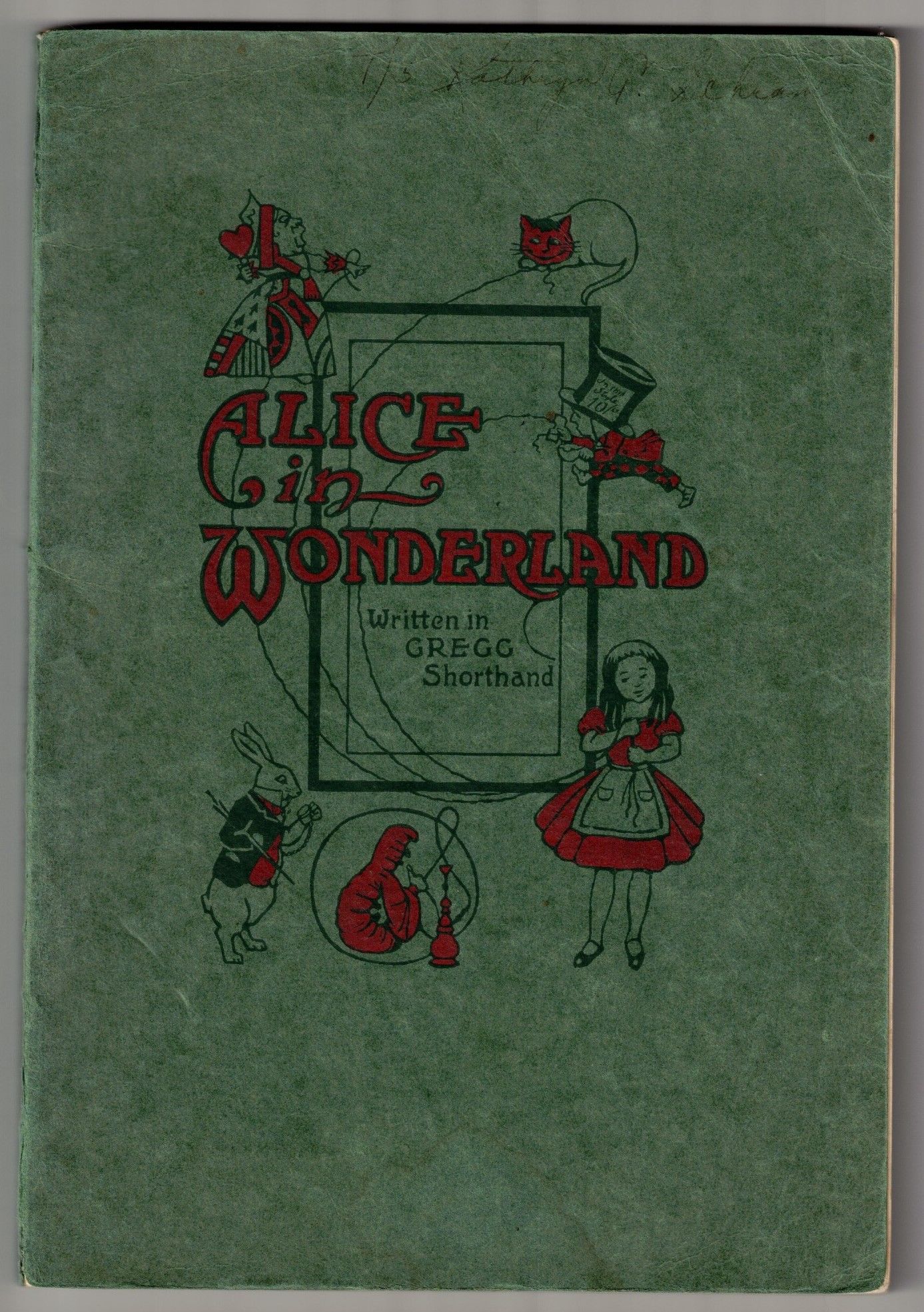 Early Gregg Shorthand edition of Alice, with shorthand plates created originally in 1915 by Georgie Gregg Gingell. An installment in a series meant to promote the use of Gregg Shorthand. Prior to computers, word processors, and the prevalent use of dictation machines, stenographers transcribed much of business and institutional correspondence, and then retyped it into sensible text. In order to better convey the diversity of the system, Gingell created an entire group of literary classics in shorthand, including Letters from a Self-Made Merchant by Latimer, Irving's Legend of Sleepy Hollow, Hamlet, Dickens' Christmas Carol, Poe's Descent into the Maelstrom, and Carroll's Alice.