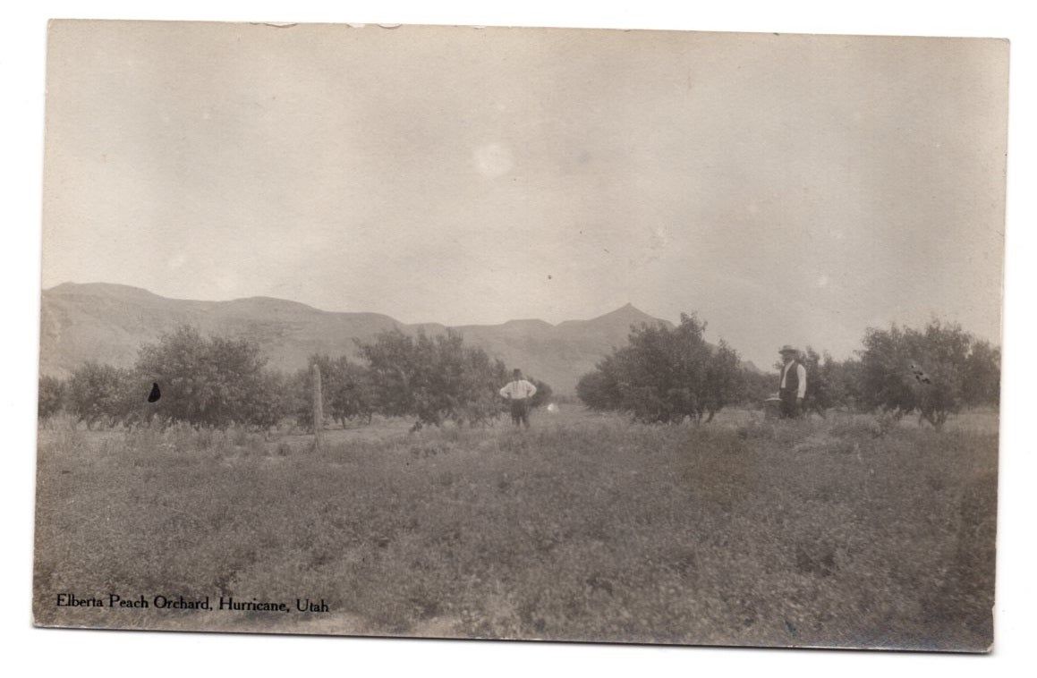 Dansville, NY: F. A. Owen Pub. Co, 1915. Very Good. Real photo postcard [9 x 13.5 cm] with divided back. This rare image of Southern Utah depicts two men standing in front of rows of peach trees with mountains in the background. Southern Utah is known for its peaches and this image shows the early successes of peach growing in the area. The town of Hurricane holds an annual "Peach Days" festival which began in 1915.