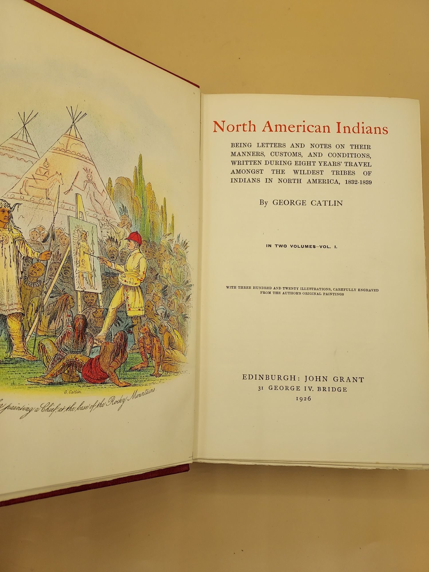 Edinburgh: John Grant, 1926. 1926 Jonathan Grant imprint. Hardcover. Very good. 298; 303pp. Royal octavo [26 cm] Publisher's original red cloth over boards with lettering and elaborate pictorial stamping in gilt and black. Top edge gilt. Light rubbing to the extremities; previous owner's brief notations to preliminary pages, including the title page of volume 2; text block very occasionally cracked. Plate at p. 166 partially detached (volume 1). An attractive set. A series of letters written by Catlin during several years' residence and travel amongst a number of very remote tribes of North American Indians.