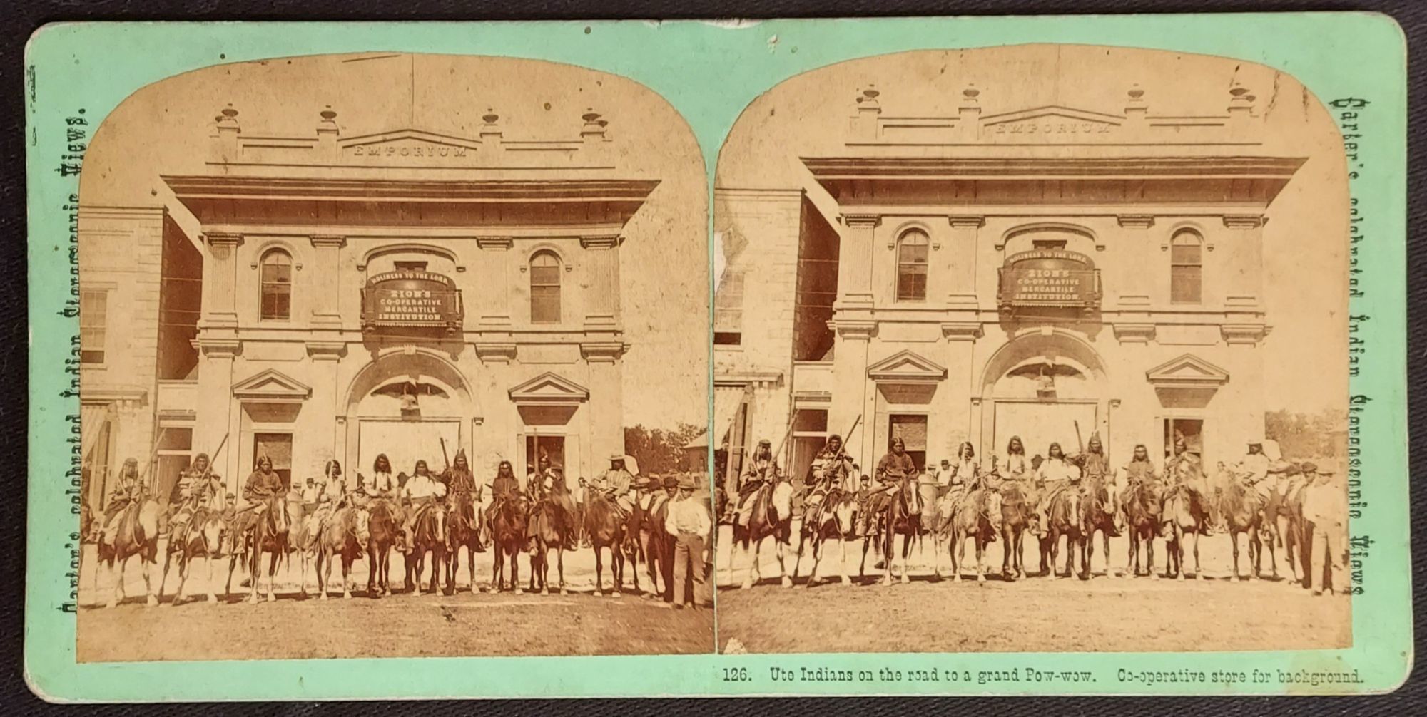 Ute Indians on the road to a grand Pow-wow. Co-operative store for background. Carter's celebrated Indian Stereoscopic Views. [Zion's Co-operative Mercantile Institution] [Z.C.M.I]