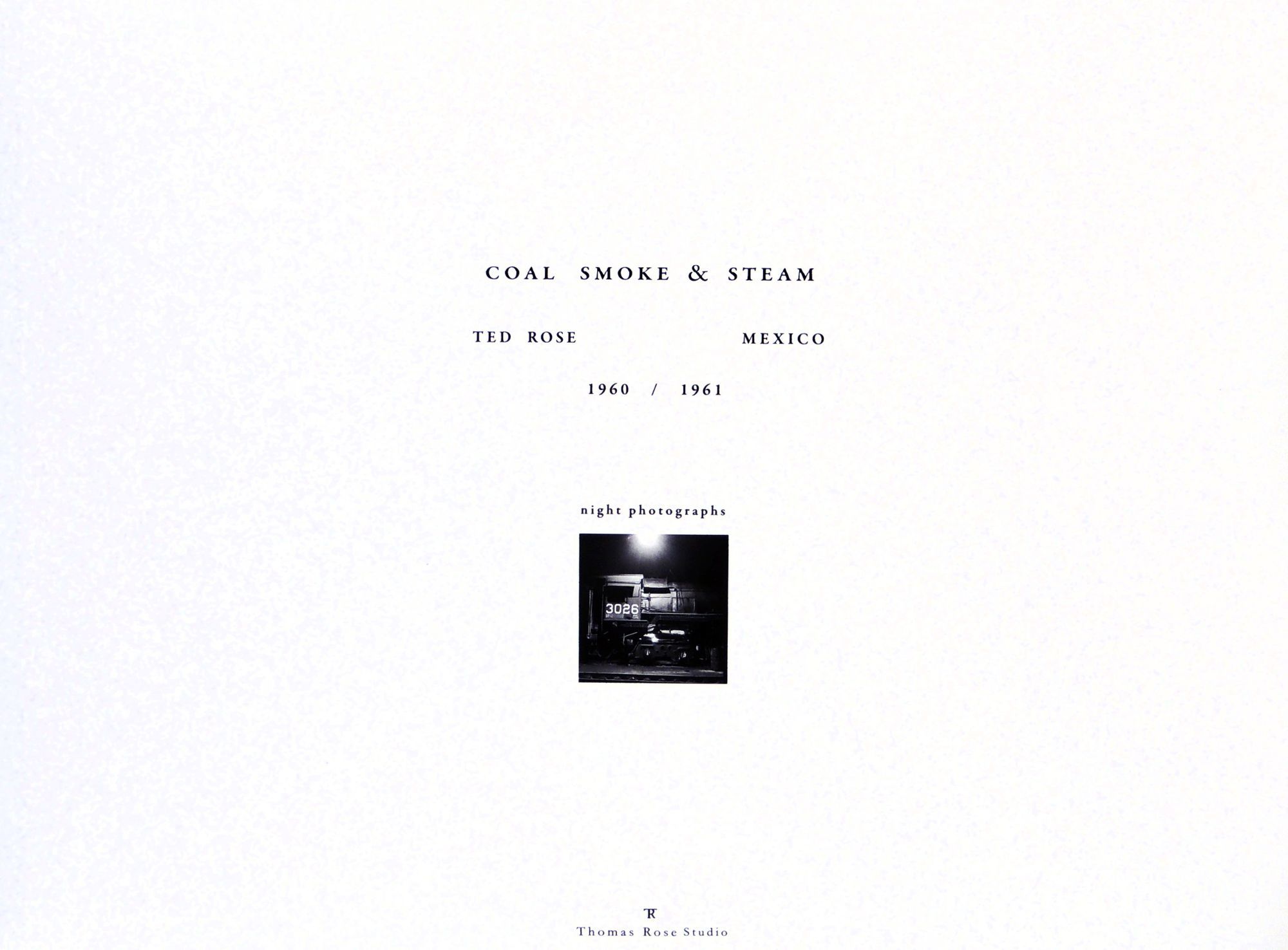 In an author's note on a separate sheet of paper that accompanies the book, Thomas writes: "[the book] considers a series of 21 photographs shot by the visual artist Ted Rose (1940-2002) between 1960 and 1961 in Central Mexico as he sought out the last working steam locomotives- many sold to Mexico when U.S. companies transitioned to diesel.....As I structured the form of the book around the sublime in Rose's night photographs I chose to highlight those with the greatest density of black, with emphases on the blur of smoke and steam." Thomas continues: