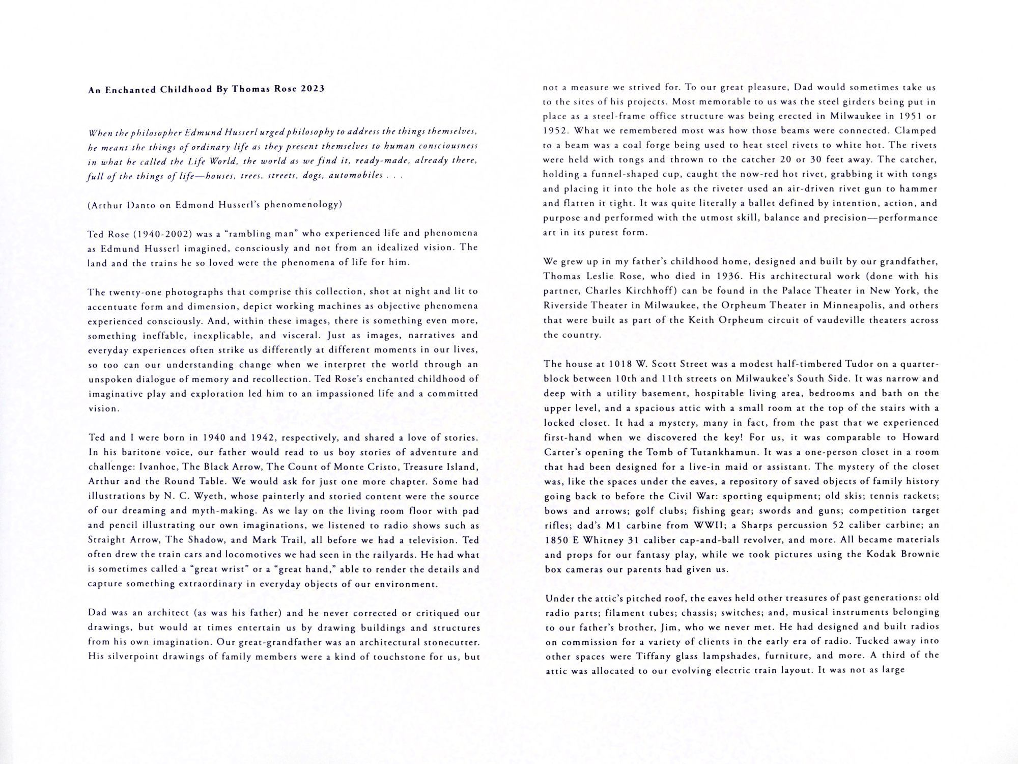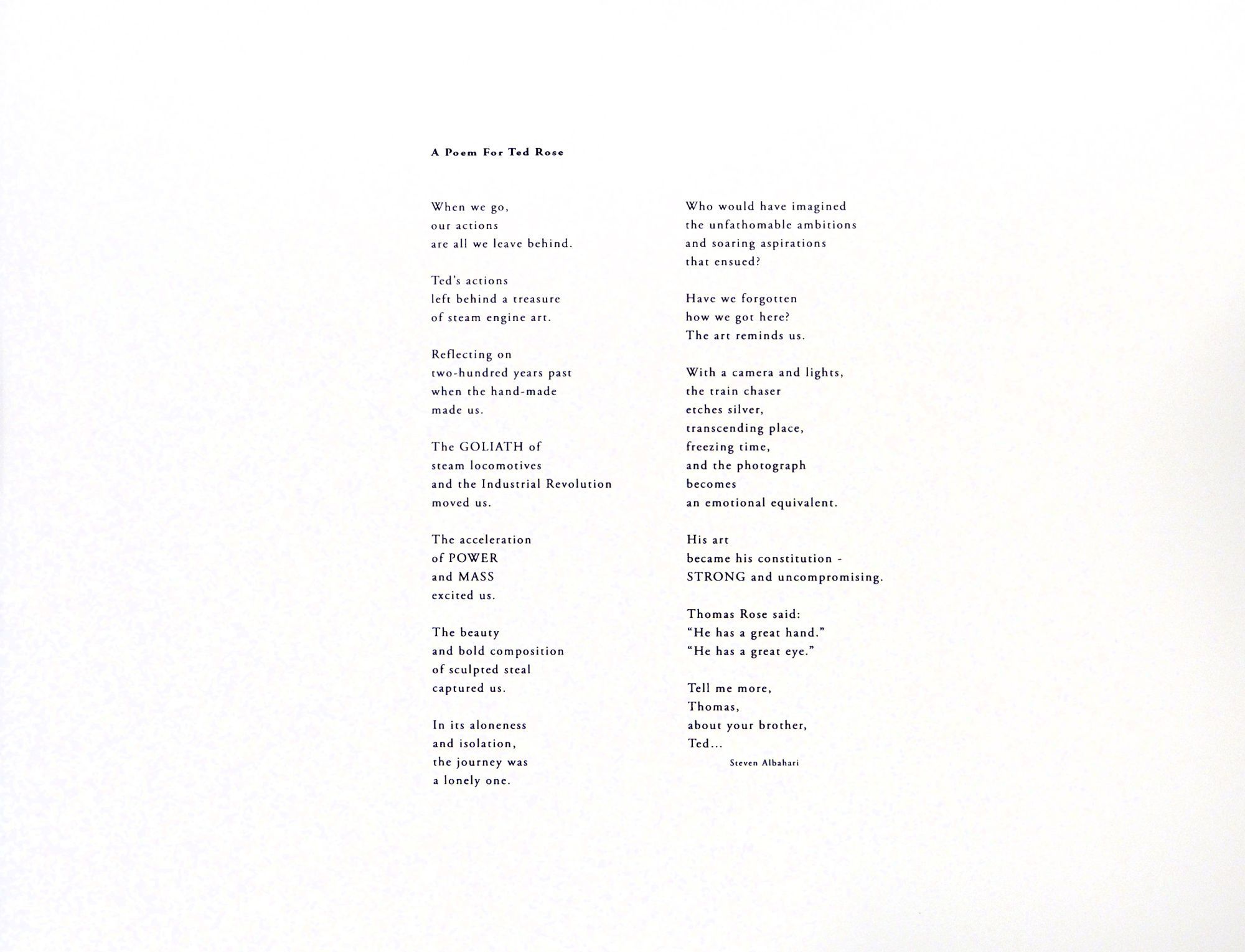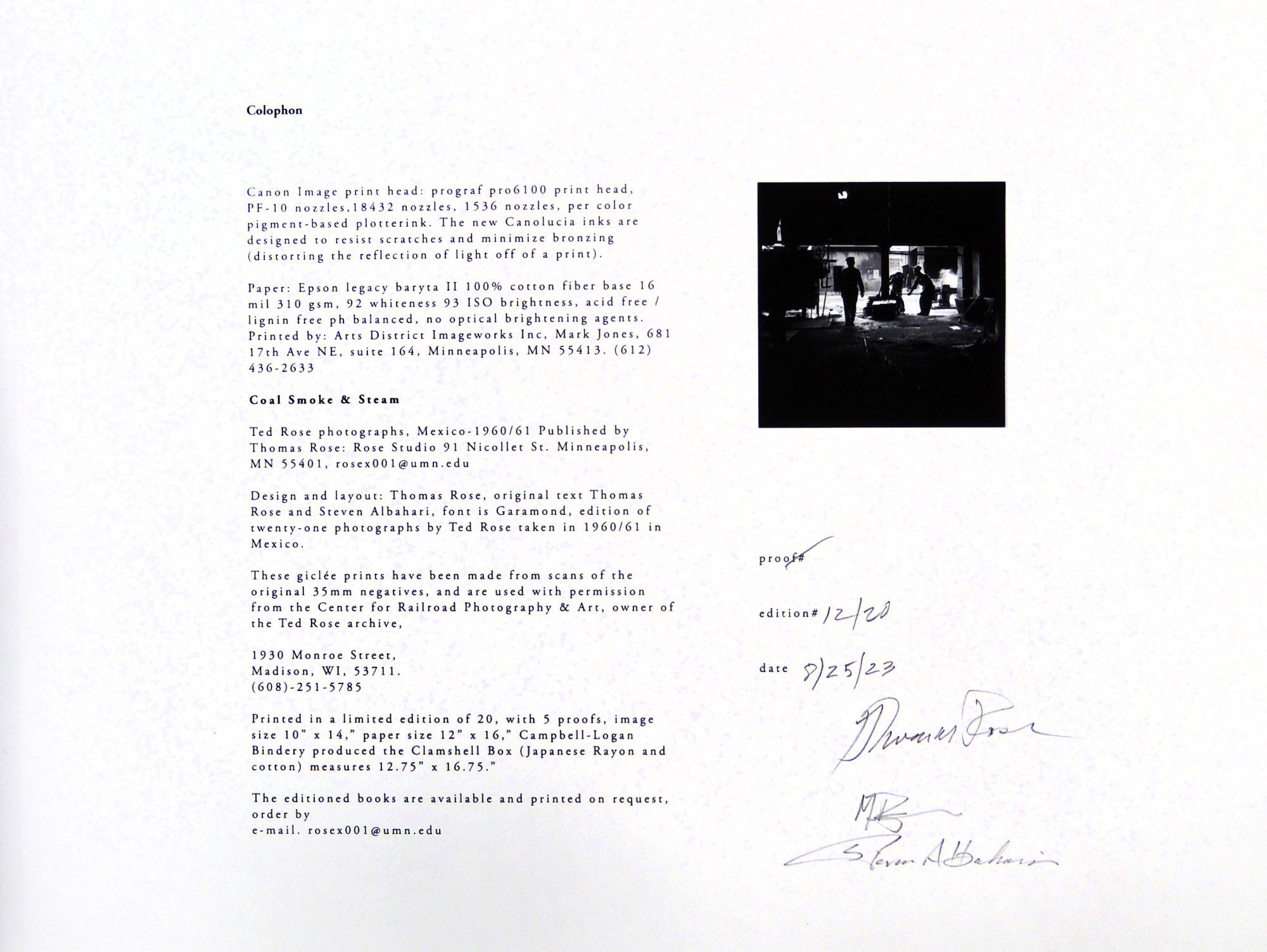 Minneapolis: Thomas Rose Studio, 2023. Hardcover. Fine. Hardcover. Number 12 of 20 copies signed and numbered by Thomas Rose. Also signed by Steven Albahari, artist and photographer who wrote the text with Thomas and a poem for Ted Rose that is a preface to the text. This is a stunning book that Thomas Rose has created as an homage to the spectacular railroad photography done by his brother Ted in the early 1960s. Thomas writes in his author's notes: Because the railroad images were the oeuvre and focus in much of Ted's work, his works appeal to that genre. Ted's interests as I mention in this book have more to do with the transition of technology and the post war industrial landscape. The historical aspect of the book is with the photographs from 1960-61 and the sell-off these [iconic] steam engines to Mexico.
