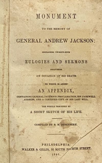 Philadelphia: Walker & Gillis, 1846. Hard Cover. Fair/No Jacket. 0x0x0. Binding very weak but still holding, rear joint starting, loss to spine base, boards soiled, pages foxed. 1846 Hard Cover. 416, 3-4, 1-2 pp. This book is a collection of eulogies and sermons delivered in honor of General Andrew Jackson after his death. It also includes an appendix containing General Jackson's proclamation, farewell address, and a certified copy of his will. This book provides insight into the life of one of America's most iconic military leaders and presidents.