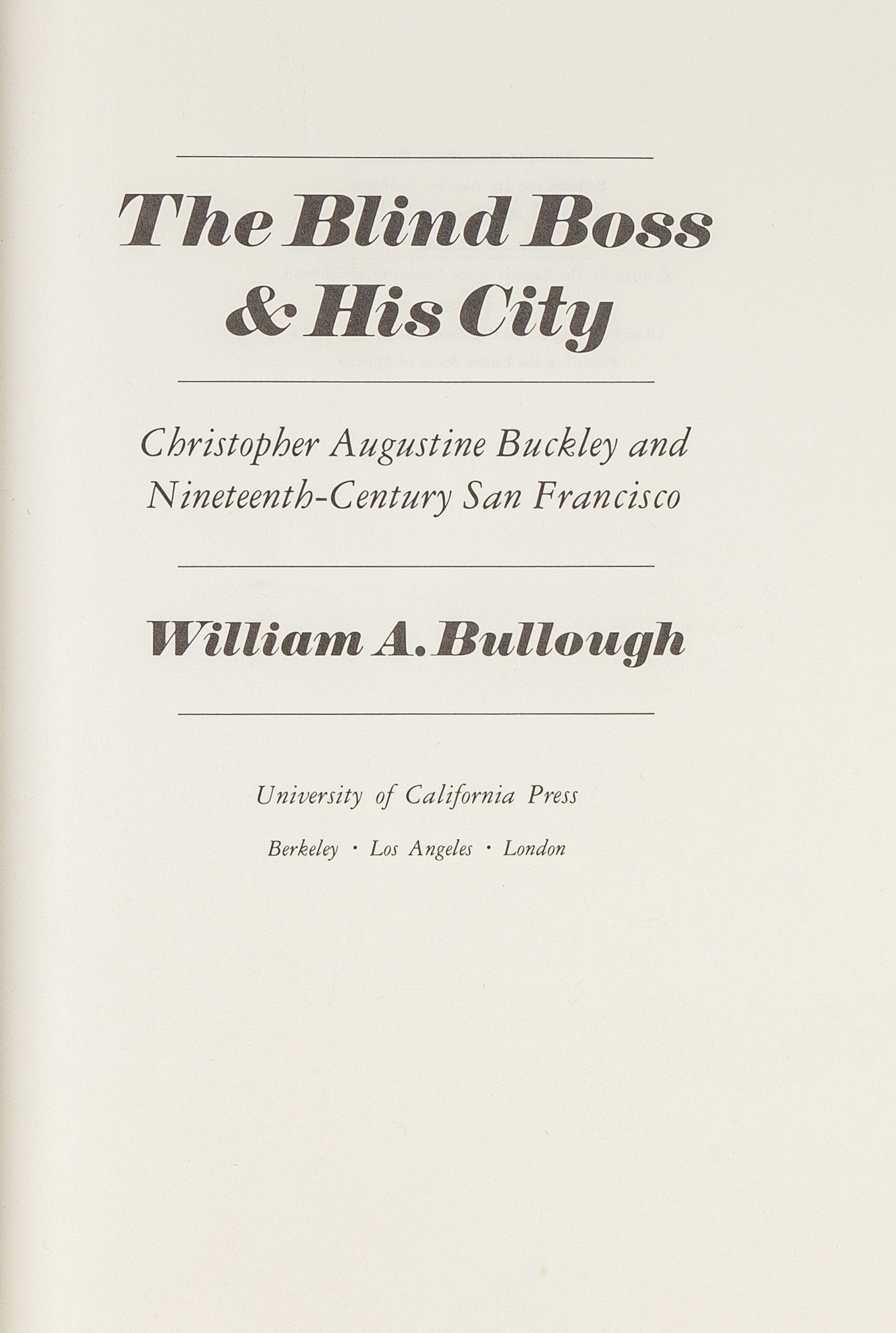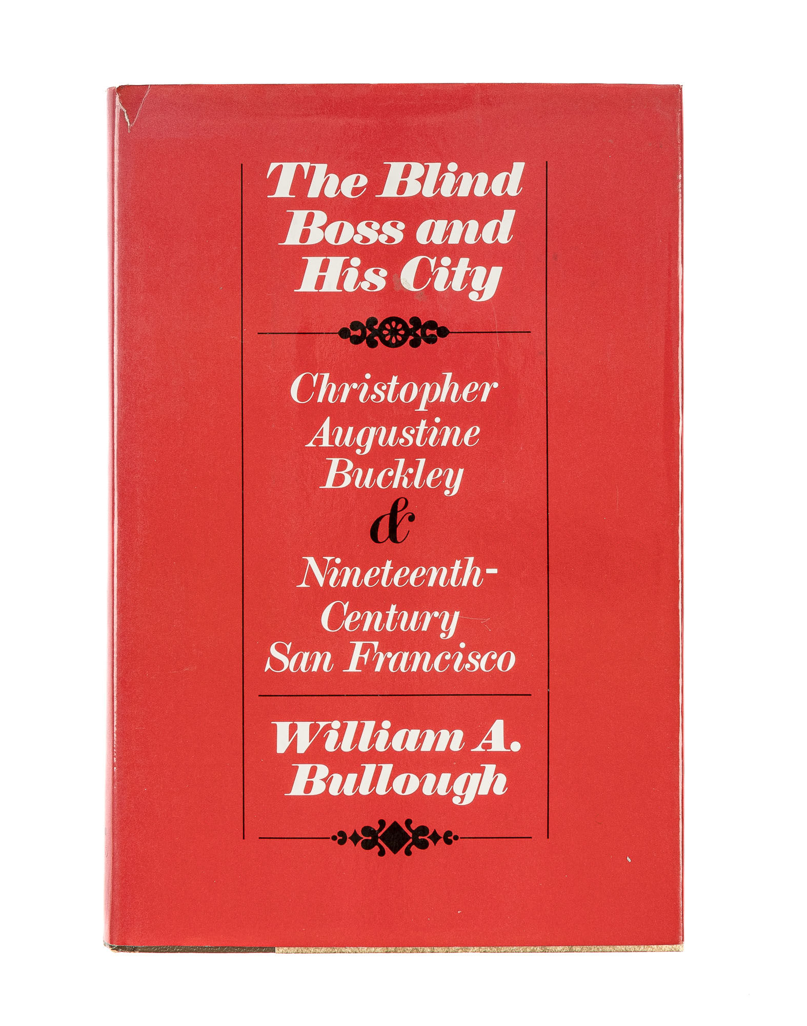 1979. Bullough, William A. The Blind Boss & His City: Christopher Augustine Buckley and Nineteenth-Century San Francisco. Berkeley: University of California Press, 1979. xvi, 347 pp., illustrations, frontispiece. Publisher's original cloth, with gilt stamped spine. Near fine, in a good dust jacket with a small tear to head of spine. $15.
