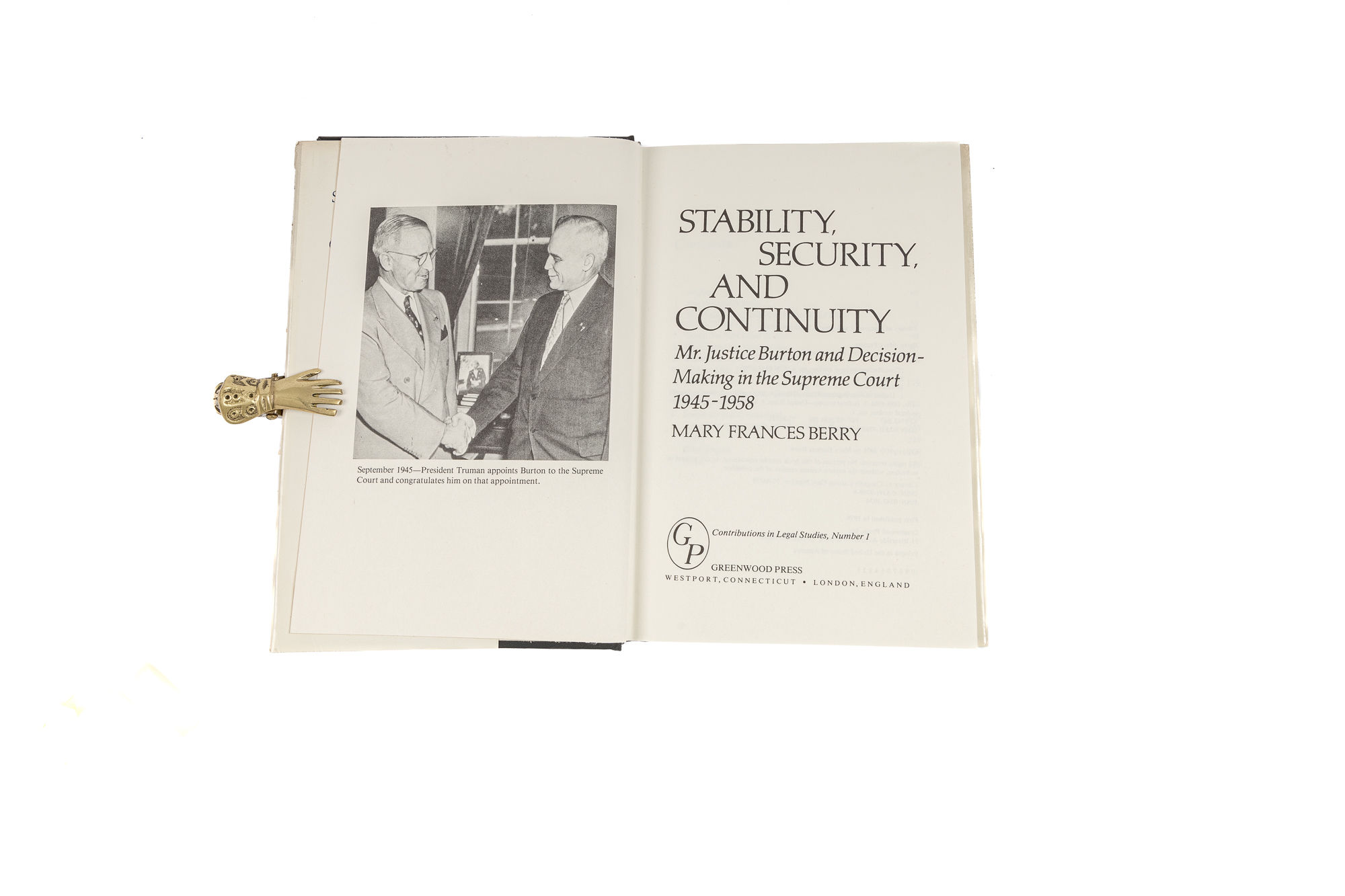 1978. Berry, Mary Frances. Stability, Security, and Continuity: Mr. Justice Burton and Decision-Making in the Supreme Court, 1945-1958. Westport, [Conn.]: Greenwood Press, [1978]. viii, 286 pp. Hardcover in moderately worn dust jacket. Internally clean. $60. * Harold Hitz Burton was a justice of the Supreme Court of the United States from 1945 to 1958.