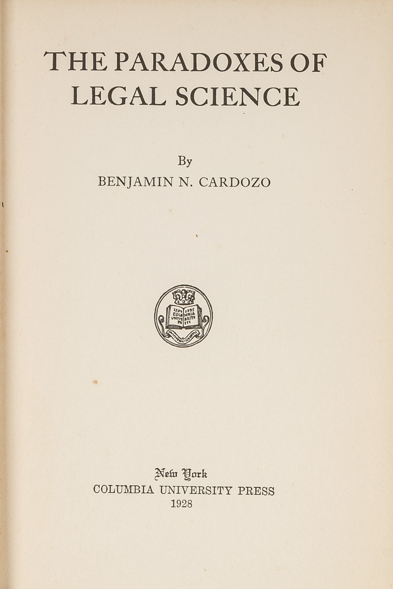 1928. New York: Columbia University Press, 1928.. New York: Columbia University Press, 1928. From the Library of Frederick Bernays Wiener Cardozo, Benjamin N. [1870-1938]. The Paradoxes of Legal Science. New York: Columbia University Press, 1928. v, 142, [1] pp. Original cloth, gilt title to spine, blind frames to boards, gilt Columbia University Press crest to center of front board. Light shelfwear, light fading to spine, some fraying to head of spine, owner signature in pencil (Charles L. Keltz) and bookplate of Frederick Bernays Wiener to front pastedown, moderate toning to interior. $350. * First edition, first printing. One of Cardozo's most important books, The Paradoxes of Legal Science is a classic statement of juristic pragmatism. As Goodhart has pointed out, it also reveals the non-legal sources, such as Greek philosophy, that informed his work. At the time of this book's publication Cardozo was the chief judge of the New York Court of Appeals, a post he held until his appointment to the U.S. Supreme Court in 1932. Wiener [1906-1996] was an authority on military and constitutional law. He had a long career in government, the U.S. Army (active and Reserve) and academia. While a lawyer in the Solicitor General's Office he successfully argued the landmark 1957 Supreme Court case Reid v. Covert, which established that non-military U.S. citizens outside of the territorial jurisdiction of the United States cannot be tried by a U.S. military tribunal. They retain the protections guaranteed by the United States Constitution. Goodhart, The Jewish Lawyers of the Common Law 59-60.