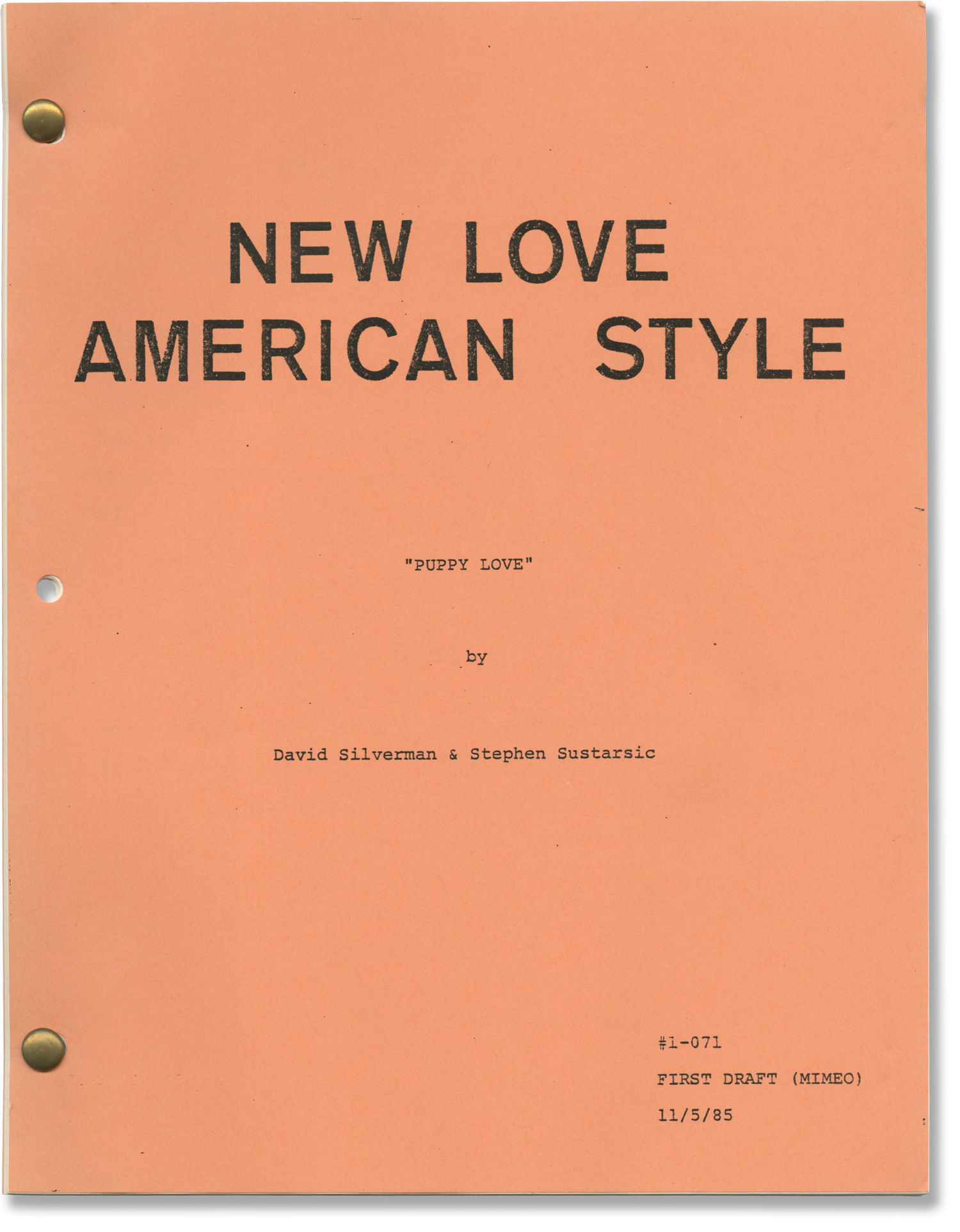 Salmon titled wrappers, noted as FIRST DRAFT on the front wrapper, dated 11/5/85, with credits for screenwriters David Silverman and Stephen Sustarsic. Title page integral with front wrapper. 14 leaves, with last page of text numbered 13. Mimeograph duplication, rectos only. Pages Near Fine, wrapper Very Good plus, bound with two gold brads.