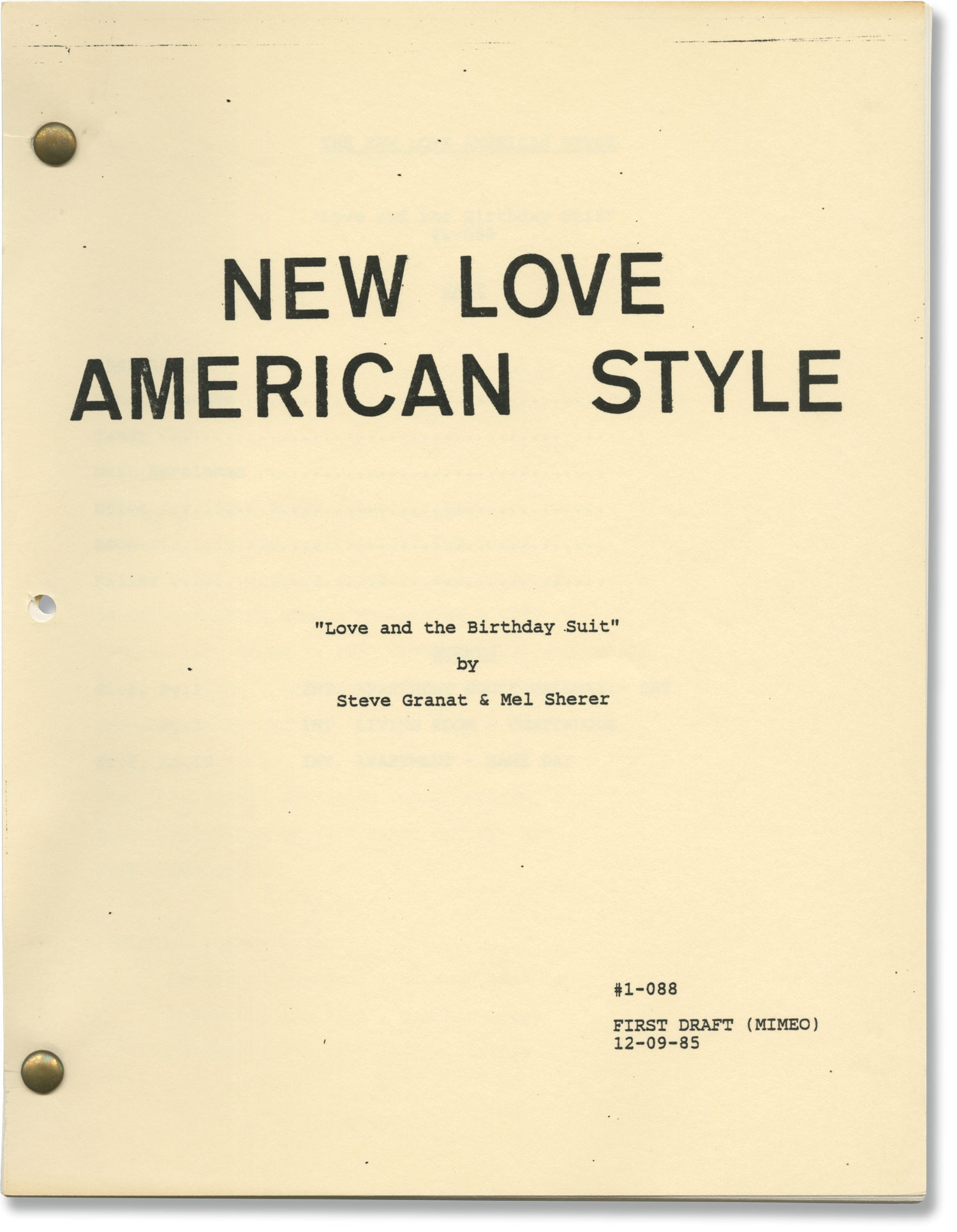 Beige titled wrappers, noted as FIRST DRAFT on the front wrapper, dated 12/09/85, with credits for screenwriters Steve Grant and Mel Sherer. Title page integral with front wrapper. 22 leaves, with last page of text numbered 21. Pages Near Fine, wrapper Near Fine, bound with two gold brads.