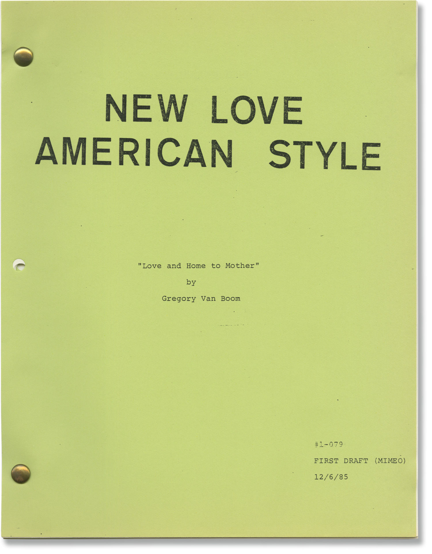 Lime titled wrappers, noted as First Draft on the front wrapper, dated 12/6/85, with credits for screenwriter Gregory Van Boom. Title page integral with front wrapper. 16 leaves, with last page of text numbered 15. Mimeograph duplication, rectos only. Pages Near Fine, wrapper Near Fine, bound with two gold brads.