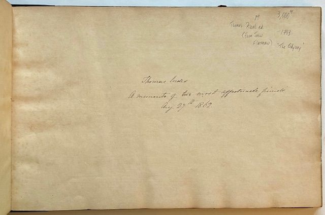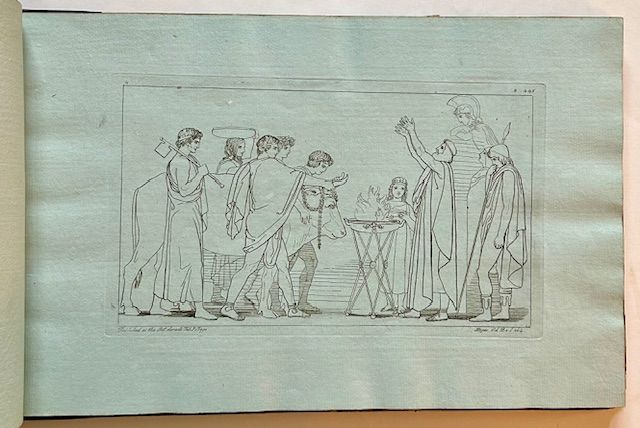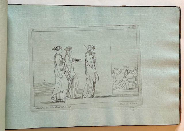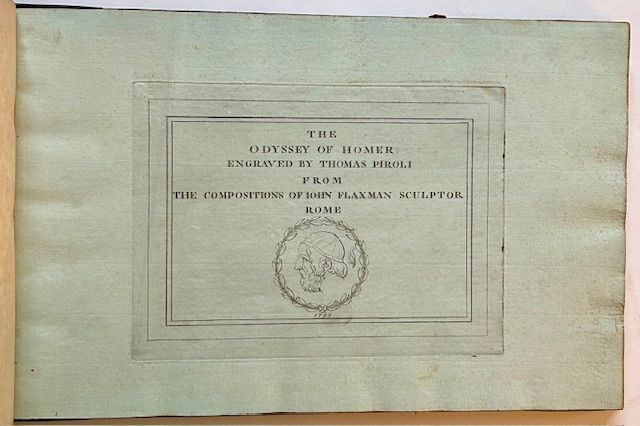 Rome, 1793. 1/4 leather. Very Good. Thomas Piroli (John Flaxman). The 1793 1st appearance of the Thomas Piroli engravings (from the compositions of John Flaxman) of both The Iliad and The Odysssey. Collected in a single volume which has been bound in a handsome 19th century 1/4 leather over marbled boards. An oblong folio, solid and VG+ (with light wear at the tips). Original plain blue wrappers, title page plus 28 plates for The Odyssey, title page plus 34 plates for The Iliad. Armorial bookplate (Thomas Cordes) at the front pastedown, neat 1862 inscription (also by Cordes) at the first blank endpaper, light staining along the edges of the blank rear endsheets. The true 1st Piroli printing of these famous plates, much reprinted, along with Aeschylus and Hesiod (whose engravings William Blake was famously engaged to create in 1805). Thomas Piroli's interpretation of both The Iliad and The Odyssey (the first two of the four Piroli titles) is a strikingly beautiful production, especially on the blue paper. Many later versions were printed, with the text in French. The influence though of John Flaxman on William Blake is clearly seen in a number of the plates.