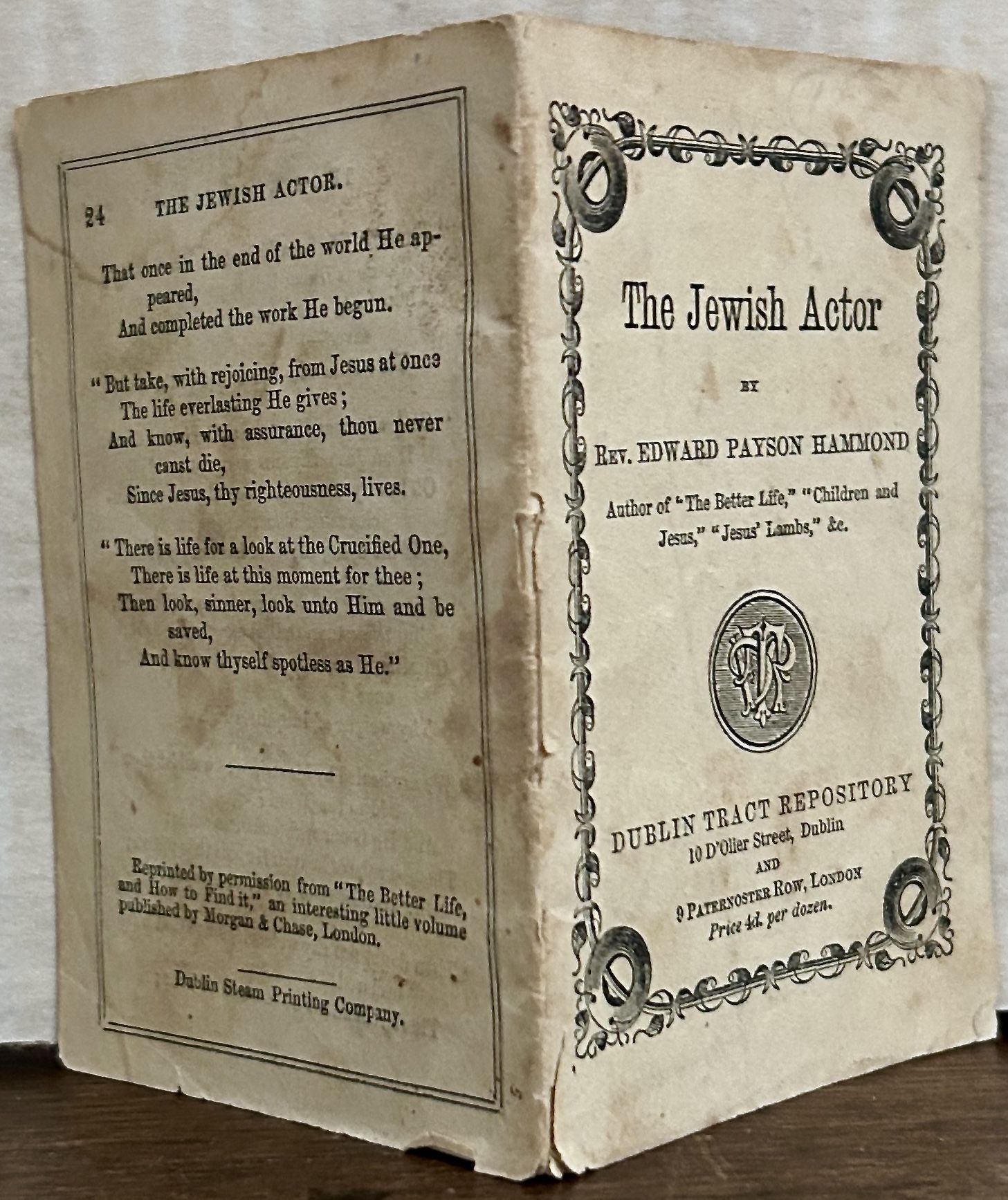 Dublin: Dublin Tract Society, 1870. Pamphlet. Orig. beige decorated wrappers. Near fine. 24 pages. 11 x 7 cm. Jewish actor abandons his religion and converts to Christianity, which we can assume is a happy and productive ending for the Reverend Hammond. Edward Payson Hammond was a celebrity preacher — a Billy Graham of his day. He is much less well-known in the America. OCLC: 13024320. Bright, clean copy.