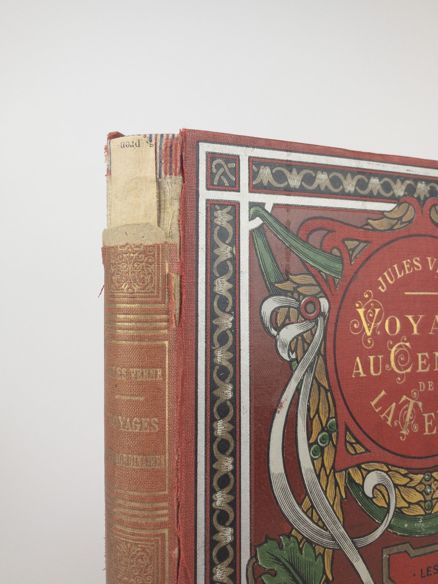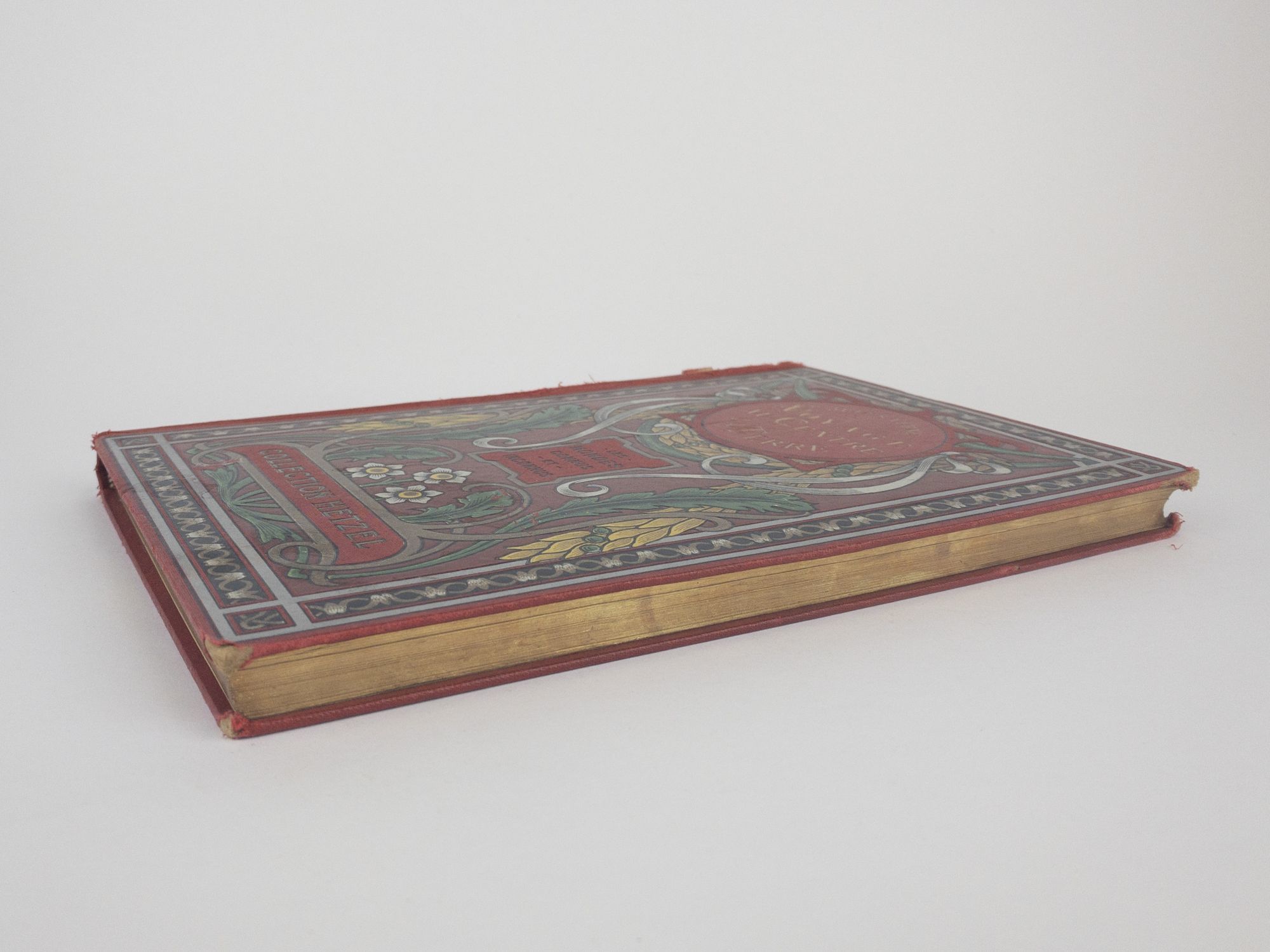 Paris: Collection Hetzel, [1906-1919]. Hardcover. Large Octavo, 219 pages. In Good condition. Spine red with gilt lettering, one inch section missing from head of spine. Textblock edges in gilt. Mild shelfwear and soiling. Multi-colored Acanthe Rouge boards bright. Slight age-toning to pages, mild foxing throughout. Text in French. Shelved in Room A Oversized. This polychrome cardboard, bound by Magnier, was published from 1906 to 1919. 1382964. Special Collections.