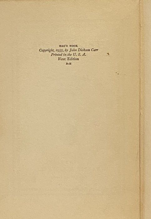 New York: Harper & Brothers, 1933. First Edition. Hard Cover. Good/No Jacket. First edition. Lacks jacket. Boards soiled, spine leans, corners slightly exposed, ink number on top edge, light smudge on bottom edge, ink date on front endpaper, toned section on half-title page and flyleaf from now-absent clipping once laid in. 1933 Hard Cover. 296 pp. A detective novel by the Golden Age mystery author who also wrote under the names Carter Dickson, Carr Dickson, and Roger Fairbairn. Carr was considered a master of the 'locked room' sub-genre. This book is the first to feature his popular Dr. Gideon Fell character. "In his detecting debut, larger than life lexicographer Dr. Gideon Fell is entertaining young American college graduate Tad Rampole at Yew Cottage, Fell's charming home in the English countryside. Within sight of his study window is the ruin of Chatterham Prison, perched high on a precipice known as Hag's Nook. The prison's land belongs to the Starberth family—whose eldest sons must each spend an hour in the prison's eerie "Governor's Room" to inherit the family fortune. Rampole is especially interested in the family, having met the young and beautiful Dorothy Starberth on the train from London. He readily agrees when Fell and the local reverend, Thomas Saunders, ask him to accompany them as they watch and wait for badly frightened Martin Starberth to complete 'his hour' in the prison. Martin has every reason to be afraid; more than one Starberth heir has met an untimely end. Will his turn come tonight