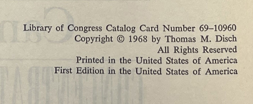Garden City: Doubleday & Company, Inc, 1969. First Edition. Hardcover. Fine/Near Fine. From the personal collection of Thomas Disch. Fine in a Near Fine jacket, unclipped ($4.95), faintly rubbed at the surface, a short closed tear at the bottom edge of the front panel. Black cloth with orange ink lettering on the spine. Firmly bound with a slight forward lean, clean internally. Disch's classic science fiction novel of a war-time mind-altering experiment conducted on prisoners as told from the perspective of eccentric poet Louis Sacchetti.