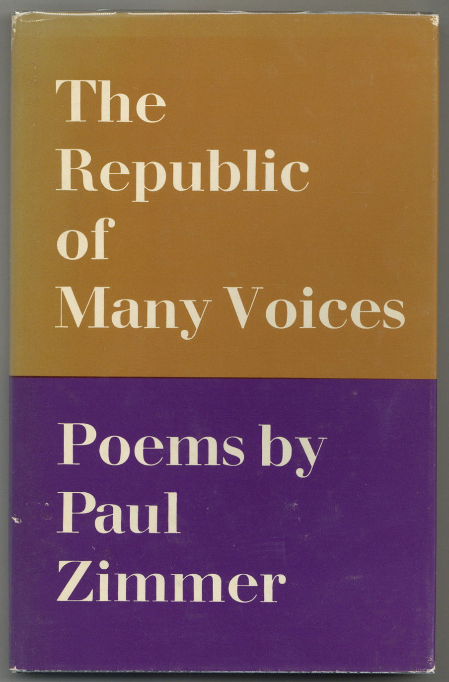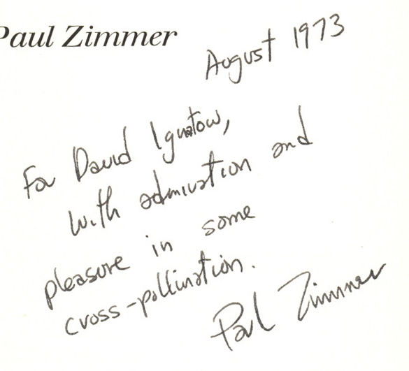 New York: October House Inc, 1969. Hardcover. Very Good/Very Good. First edition. Small soil mark on foredge, abrasion on two pages, very good in a very good dust jacket with a sunned spine and tiny nicks at the crown. From the library of poet David Ignatow and Inscribed by Zimmer: "August 1973. For David Ignatow, With admiration and pleasure in some cross-pollination, Paul Zimmer.