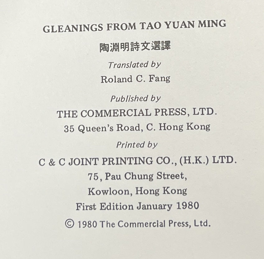Hong Kong: The Commercial Press, Ltd, 1980. First Edition. Hardcover. Near Fine/Fine. Translated by Ronald C. Fang. Near Fine in an about Fine jacket, unclipped ($12.00 sticker on the front panel), toned at the spine. Blue boards, faintly bumped at the bottom edge, with silver gilt lettering on the spine. Square and firmly bound, stained at the top edge, clean internally. A bilingual collection of the pre-Tang poet and politician's work.