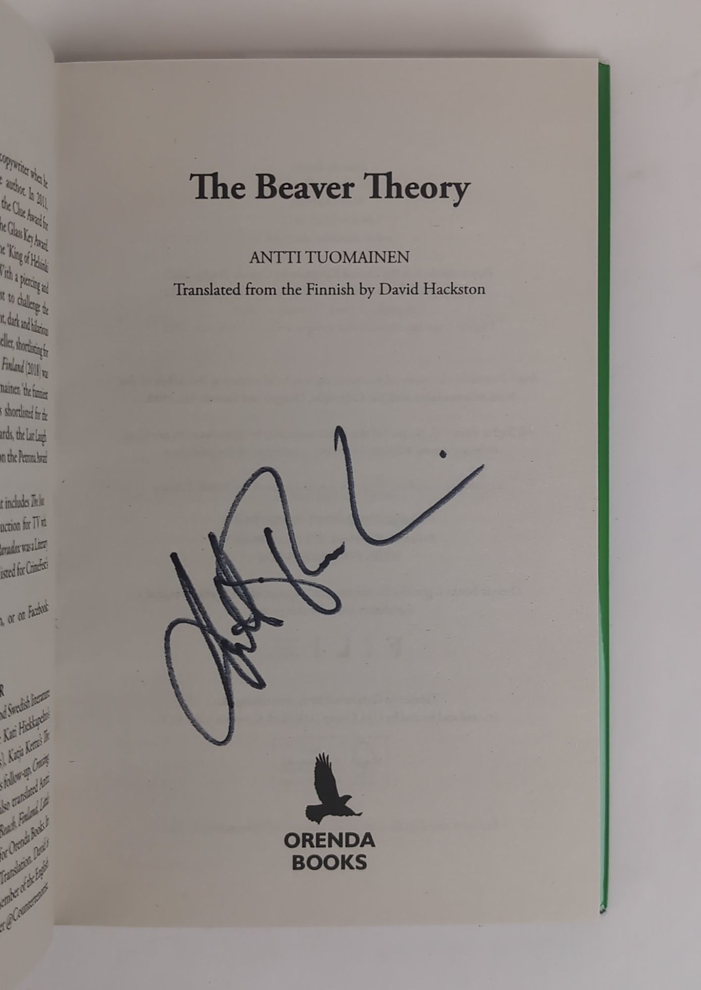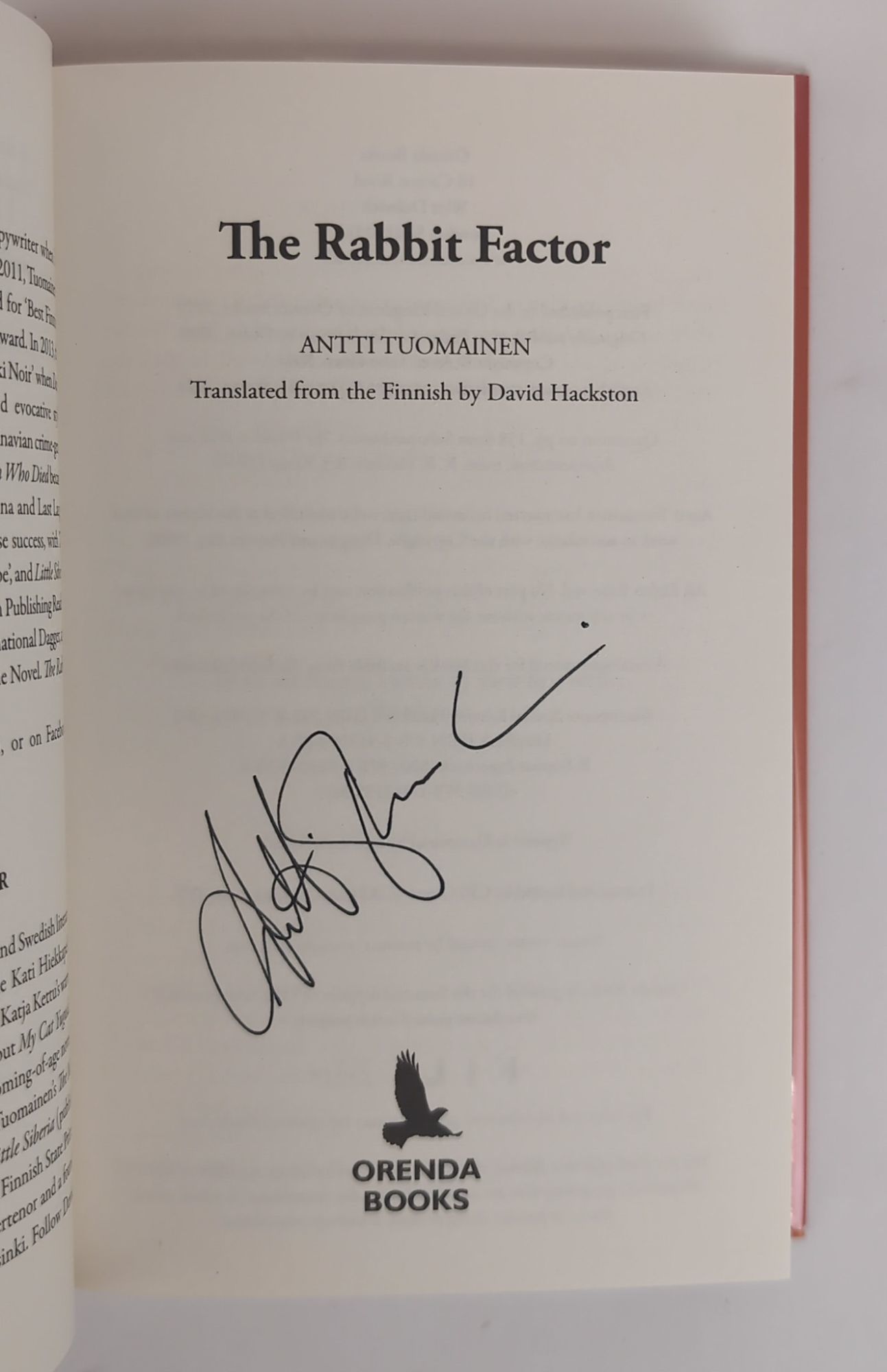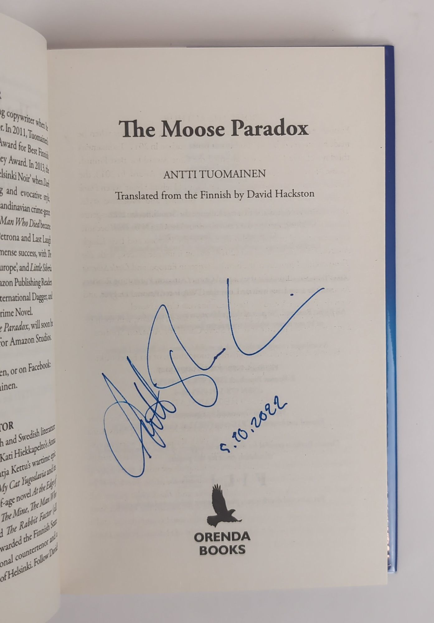 London, UK: Orenda Books, 2021-2023. First UK Edition, First Printing. Hardcover. Octavo, 3 Volumes. In Near Fine condition with Near Fine condition dust jackets. Volume 1 has an orange spine with black and white lettering, Volume 2 has a dark and icy blue spine with black and white lettering, and Volume 3 has a green spine with black and white lettering. Dust jackets are wrapped in mylar coverings. Signed flat by Antti Tuomainen on title pages, Volume 2 dated '5.10.2022'.