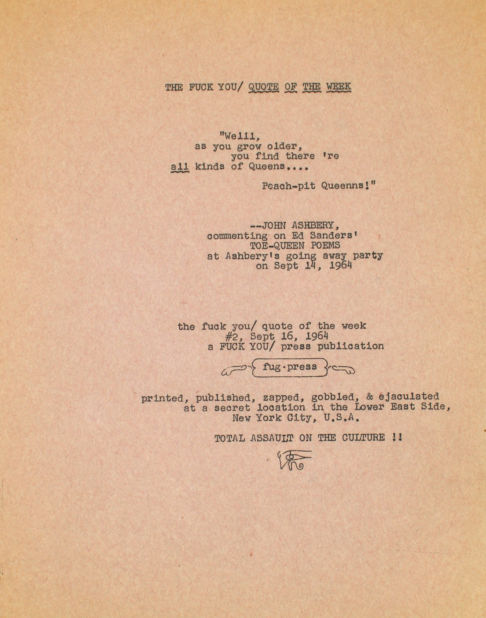 New York: Peace Eye Bookstore, 1964. First edition. Mimeograph on tan paper, recto only. 11 x 8.5 inches. Some wrinkling along outside edges, otherwise fine. First edition. Mimeograph on tan paper, recto only. 11 x 8.5 inches. The Fuck You Quote of the Week was published over three weeks in September 1964, and featured inside jokes from Harry Fainlight, John Ashberry, and Kenneth Koch.