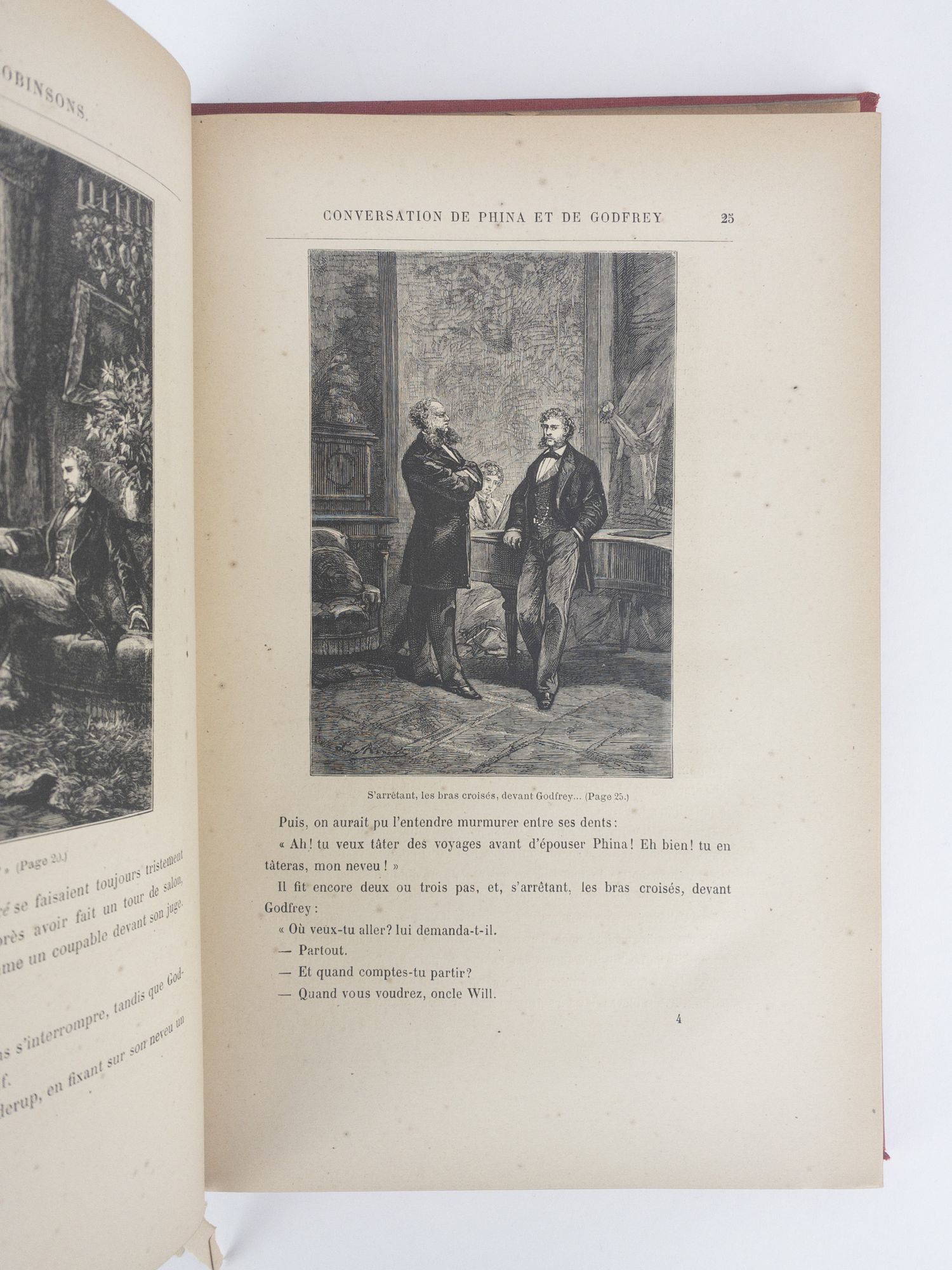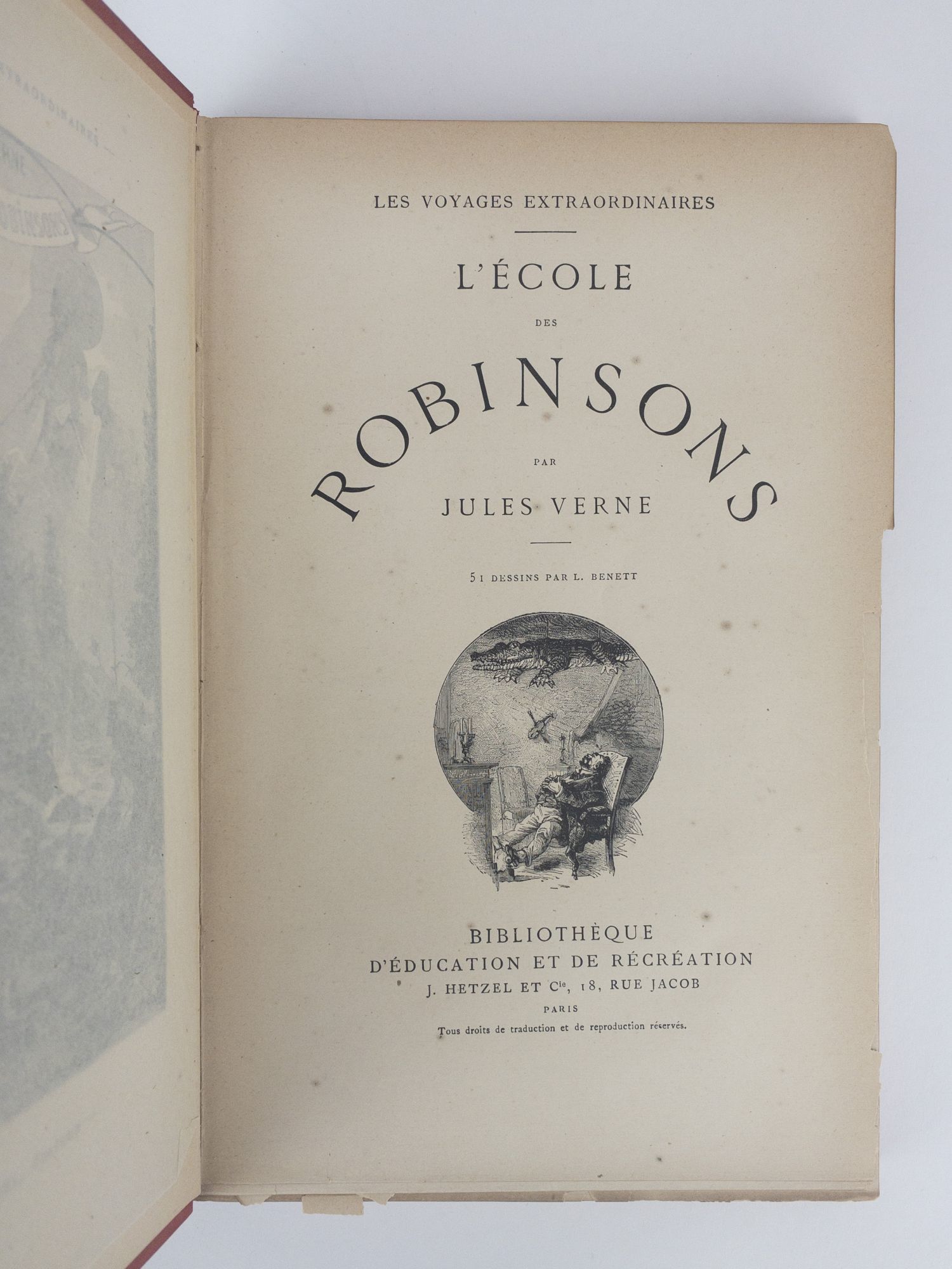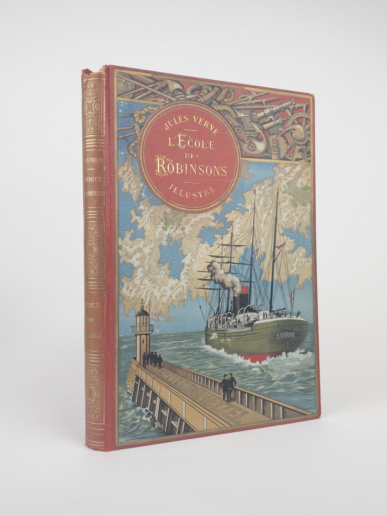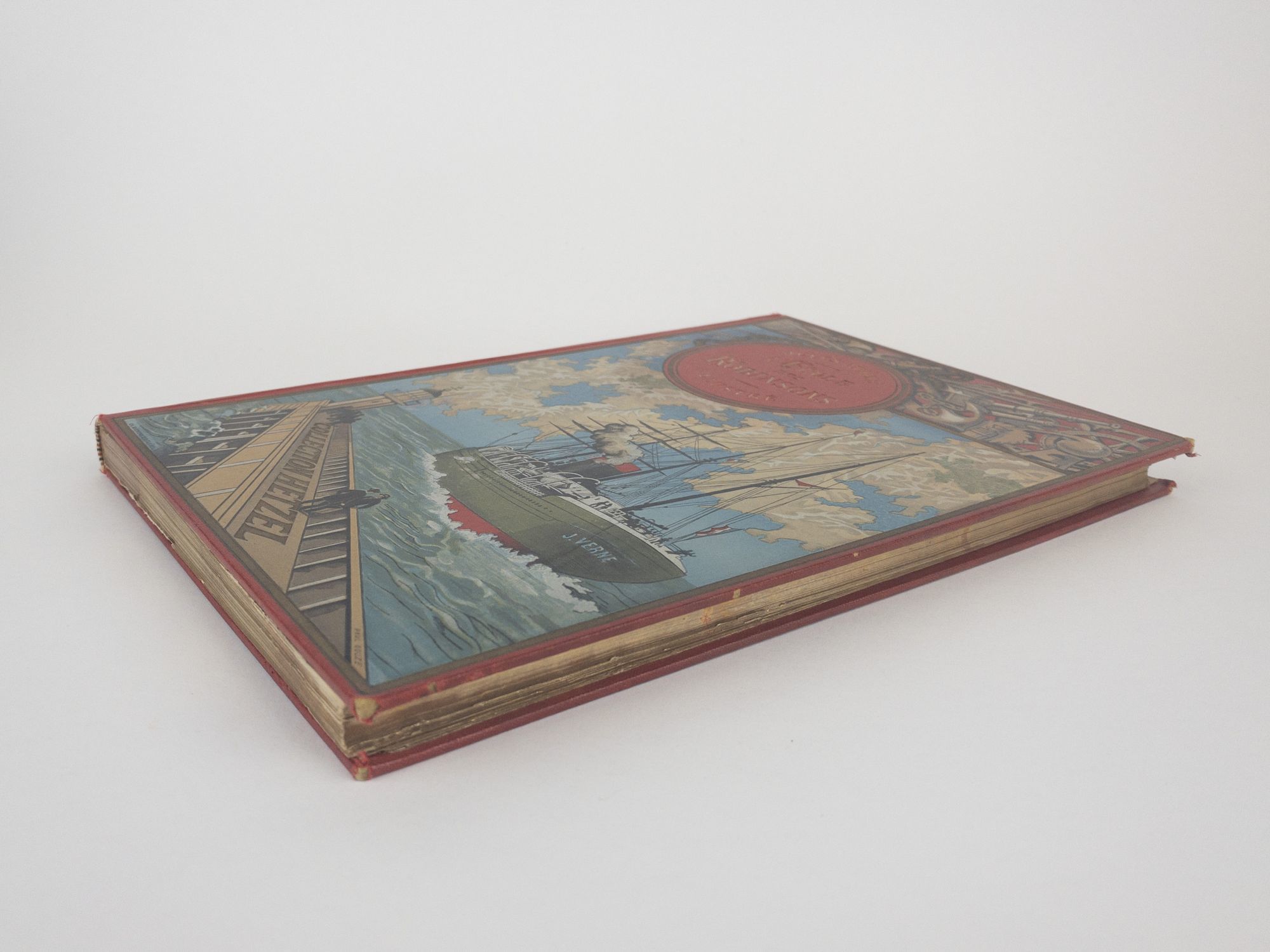 Paris: Bibliotheque d'Education et de Recreation / J. Hetzel, [1892-1905]. Hardcover. Large Octavo, 202 pages. In Good condition. Spine red with gilt lettering, sunfaded with slight tearing. Mild shelfwear and soiling. Multi-colored cartonnage polychrome boards bright. Textblock edges in gilt. Slight age-toning to pages, mild foxing throughout. Title page and first page detached with chipping to edges. Text in French. Shelved in Room A Oversized. This edition (Cartonnage au steamer - Rouge) was published between 1892 and 1905.