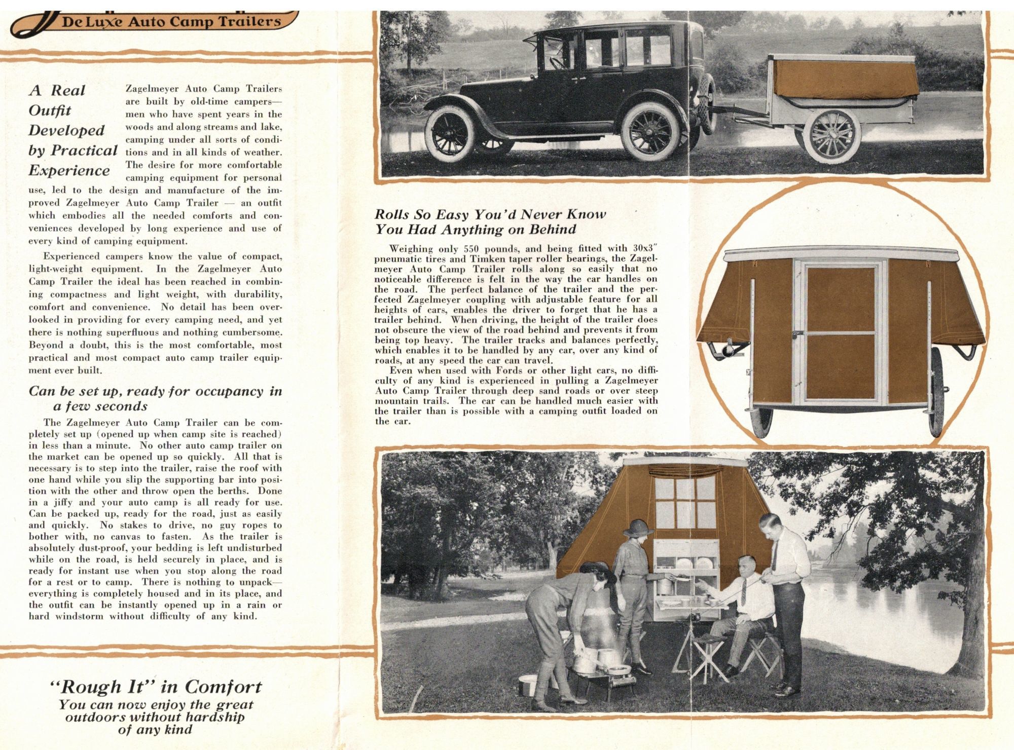 A promotional brochure for the Zagelmeyer Auto Camp Trailer, a deluxe trailer which represents convenience and camping in comfort.