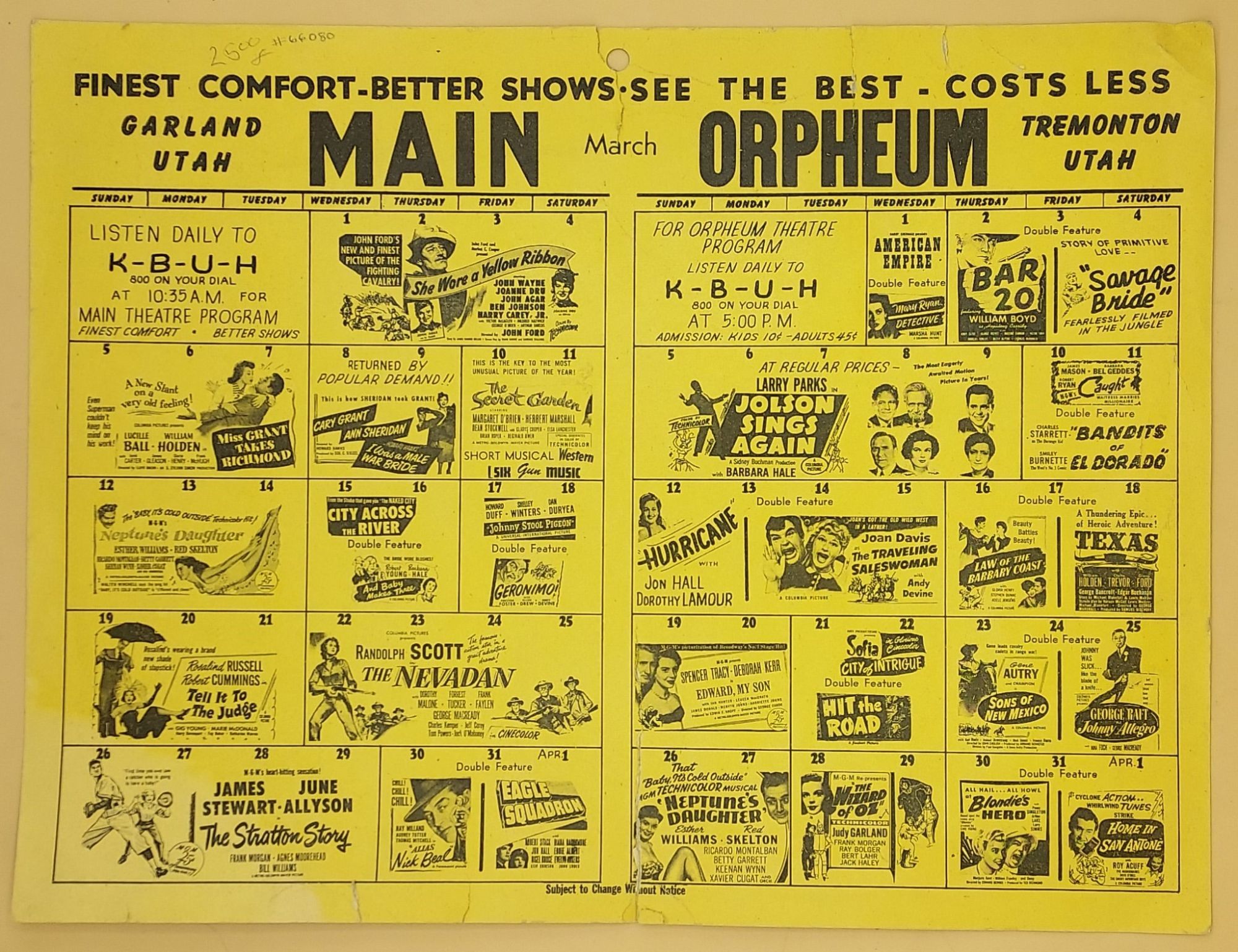Finest Comfort - Better Shows - See the Best - Costs Less. Main [Theater]. Garland, Utah. Orpheum [Theater] Tremonton, Utah. March [Calendar]