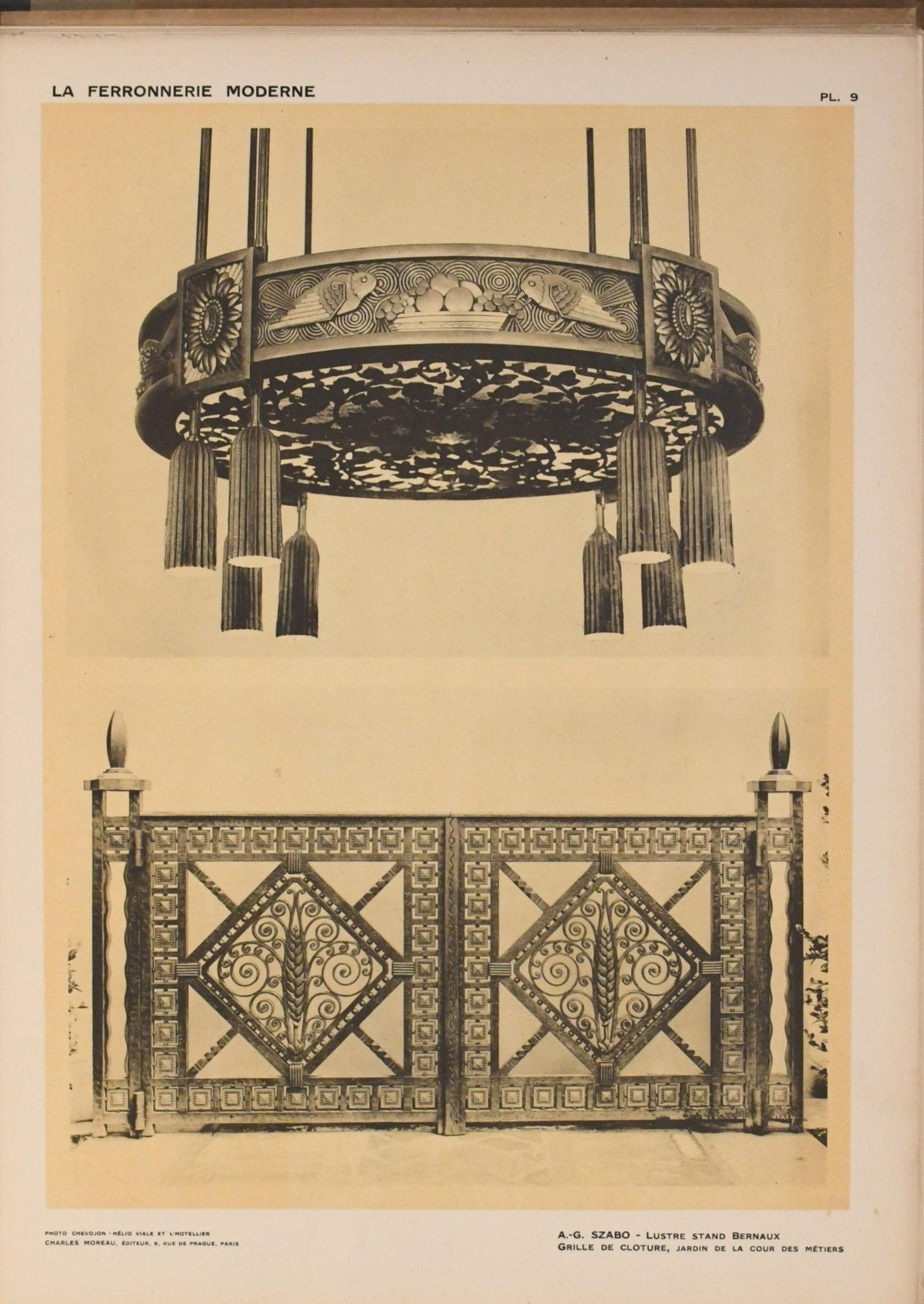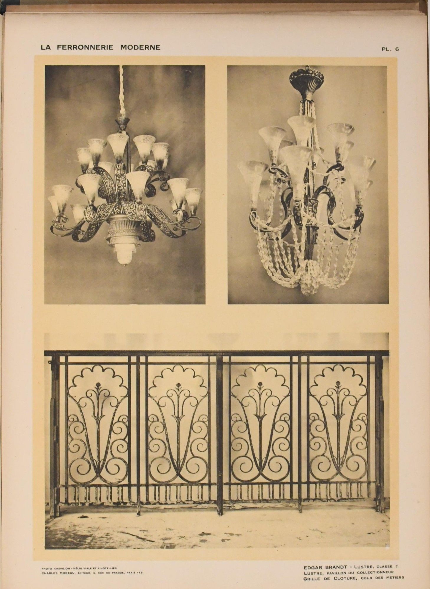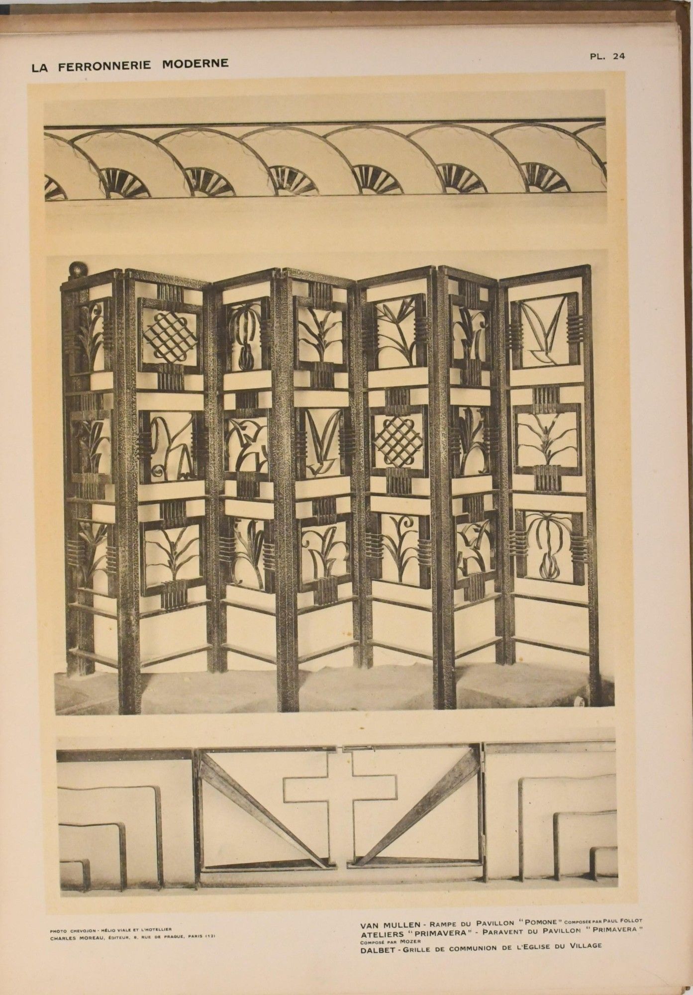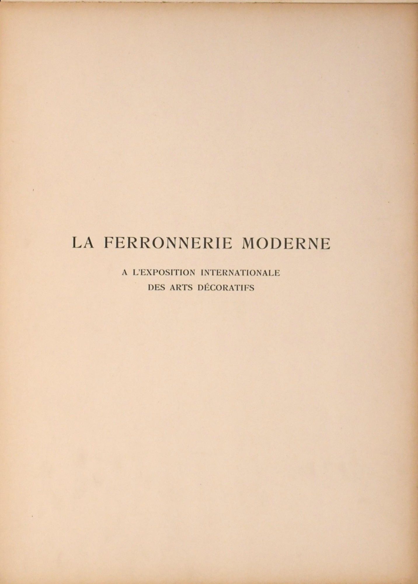 Paris: C. Moreau, 1925. Very Good binding. Folio; printed paper-covered portfolio, with 36 plates, following an introduction by Henri Clouzot, and a Table of Contents; the portfolio has ribbon ties.~~The contents are: Volume 1 : E. Brandt (pl. 1-8)--A.-G. Szabo (pl. 9)--J. Prouvé & Ch. Dumas (pl. 10)--Ch. Piguet (pl. 11)--R. Gobert & Ed. Delion (pl. 12)--G. Vinant (pl. 13)--G. Vanant, R. Subes & M. Bergue (pl. 14)--M. Bergue (pl. 15)--Vasseur (pl. 16)--Bernard & Éts. Schwartz-Hautmont (pl. 17)--Éts. Schwartz-Hautmont (pl. 18)--Baguès Frères (pl. 19-20)--R. Desvallières (pl. 21)--E. Schenck & fils (pl. 22-23)--Van Mullen, Ateliers Primavea & Dalbet (pl. 24)--R. Subes (pl. 25-28)--R. Subes, Vasseur, Christofle & Cie. (pl. 29)--Malatre, Tonnelier, Majorelle Frères (pl. 30)--Baguès Frères & P. Kiss (pl. 31)--P. Kiss (pl. 32-33)--Raingo Frères & Nics Frères (pl. 34)--Société des Hauts-Fourneaux & Fonderies de Brousseval (pl. 35)--Fonderies du Val d'Osne, Éts. Durenne & Éts. Saunier-Duval (pl. 36).~~This is the first of three volumes of La Ferronnierie Moderne; The plates are tinted, and are nice examples of Art Deco ironwork. Very Good binding.