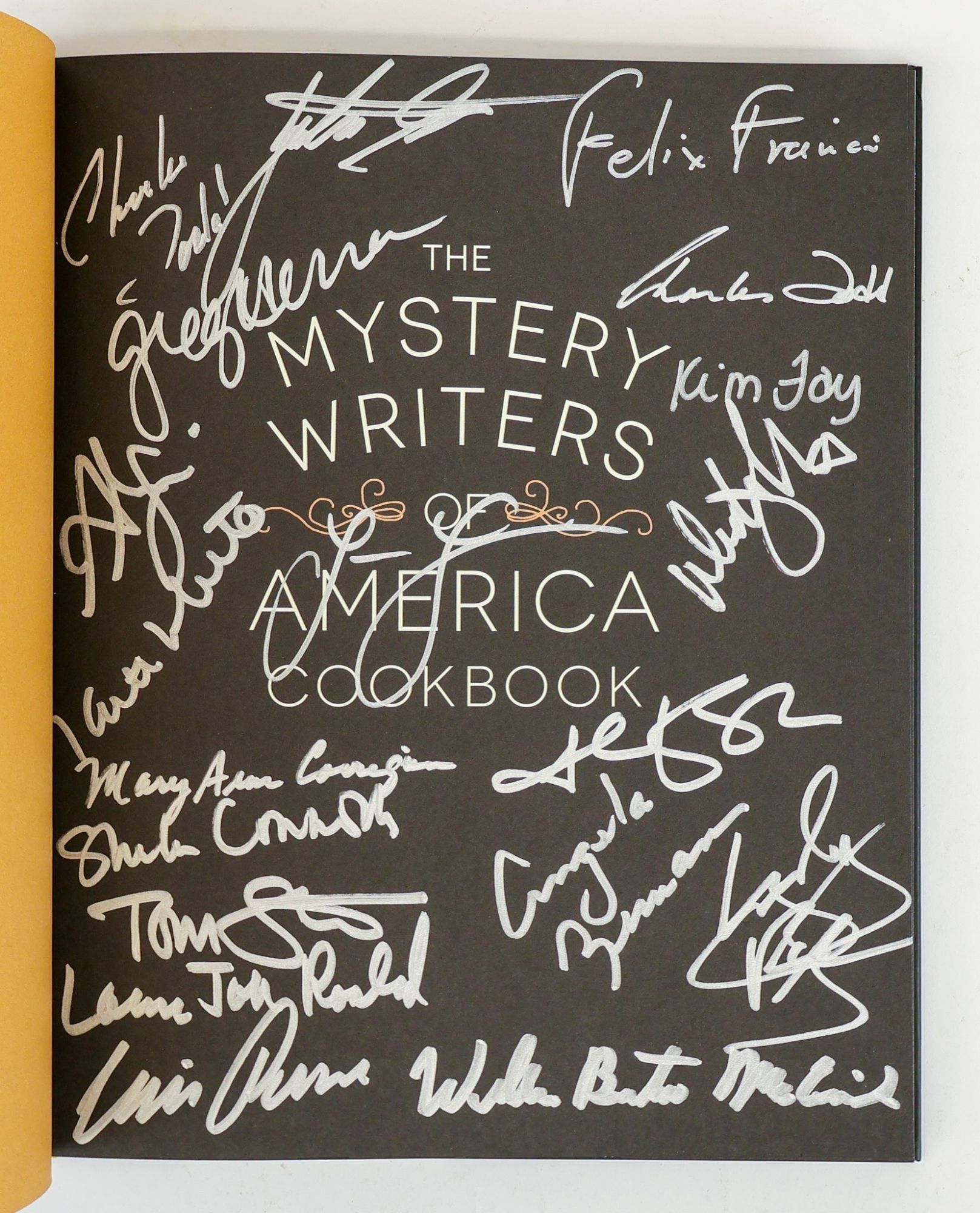 Philadelphia, PA: Quirk Books, 2015. First Edition, First Printing. Hardcover. Octavo, 175 pages. In Near Fine condition. Golden spine with black lettering. Front board is textured and has a smooth hatchet design. Signed flat by 19 contributors on the title page. Shelved in Hardcover Mystery. This book is a collection of recipes from various well-known American mystery writers, often either personal favorite dishes or dishes in reference to their books. 1383158. Shelved Dupont Bookstore.