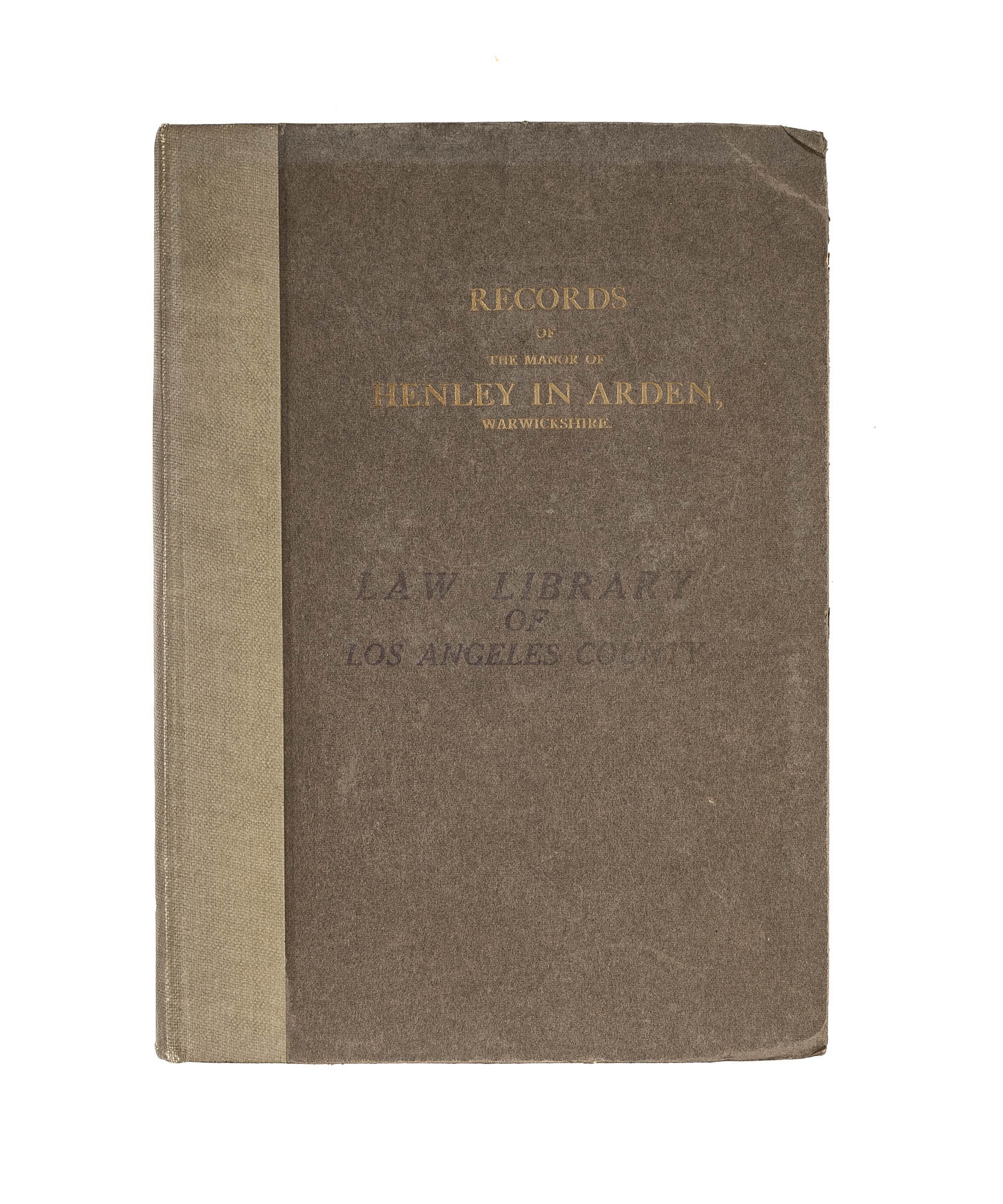 1919. Wellstood, Frederick Christian. Records of the Manor of Henley in Arden, Warwickshire. Transcribed and edited from the original manuscripts for William John Fieldhouse, Esq., J.P., C.B.E., Lord of the Manor of Henley in Arden. Stratford-upon-Avon, Shakespeare Head Press, Privately Printed, 1919. xxiv, 149 pp. Original quarter cloth to spine, with gilt stamped front cover. Wear to edges, corners, and spine ends. Ex-library, with bookplate to front pastedown, library stamps to front cover, page ends, front and rear free endpapers, perforated library stamp to title, date due slip to rear pastedown. A solid copy. $85.