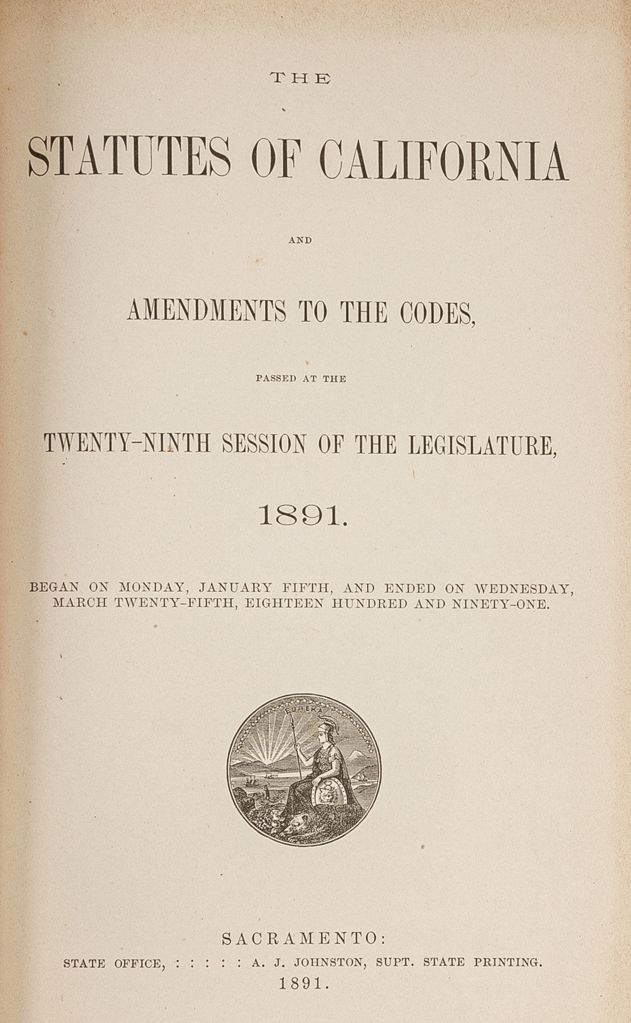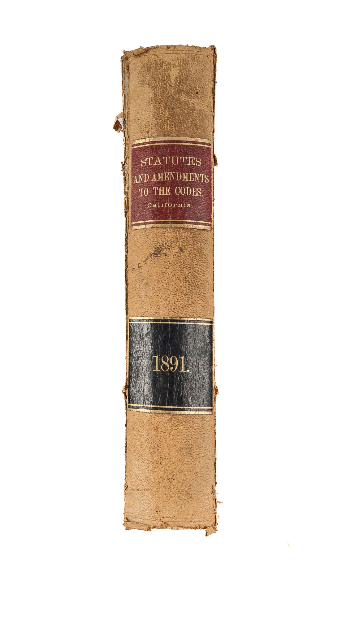1891. California. The Statutes of California and Amendments to the Codes, Passed at the Twenty-Ninth Session of the Legislature, 1891. Began on Monday, January Fifth, and Ended on Wednesday, March Twenty-Fifth, Eighteen Hundred and Ninety-One. Sacramento [CA]: State Office, A.J. Johnson, Supt. State Printing, 1891. 29th session. lvi, 566 pp. [with] Herold, Adam. Biennial Report of the State Treasurer of the State of California: Fortieth and Forty-First Fiscal Years, 1888-1890. Sacramento [CA]: State Office, J.D. Young, Supt. State Printing, 1890. 36 pp. Contemporary sheep, with gilt lettered spine label. Boards and corners heavily rubbed, rear cover detached, front hinge splitting but secure. Pages 35-36 detached. Internally clean. $50.