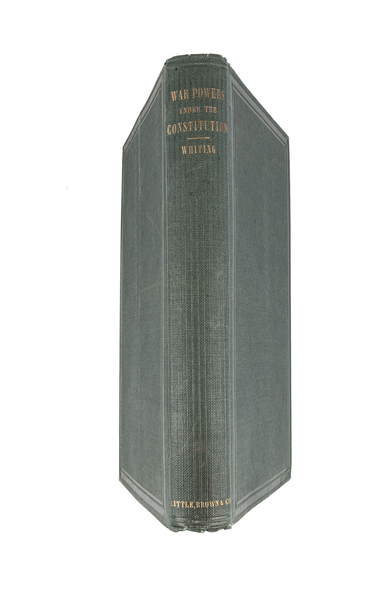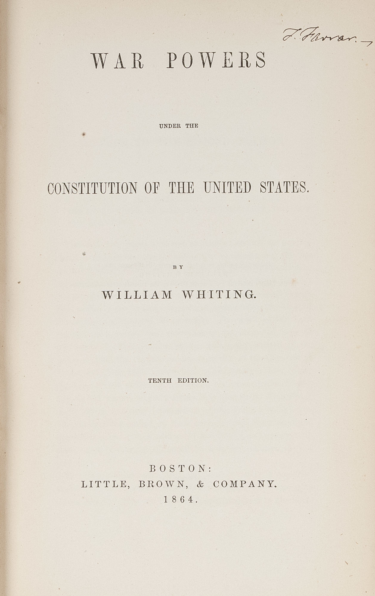1864. Whiting, William. War Powers Under the Constitution of the United States. Boston, Little, Brown & Company, 1864. 10th edition. xvii, 342 pp. Publisher's original green cloth, with gilt stamped spine. Boards rubbed, spine ends worn. The copy of notable author and jurist Timothy Farrar [1788-1874], signed by him to front free endpaper and to title. A very good copy. $150.