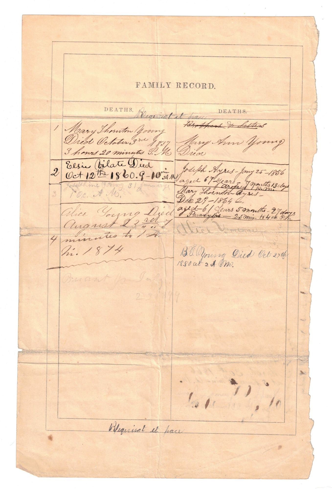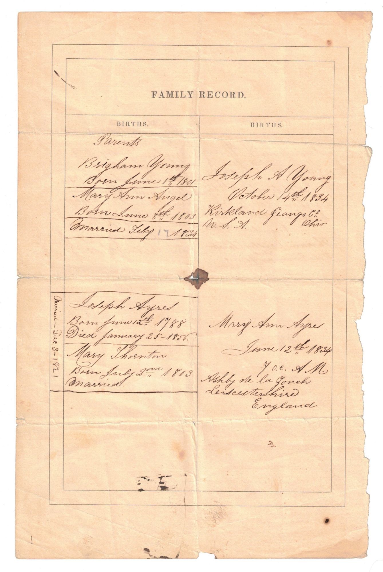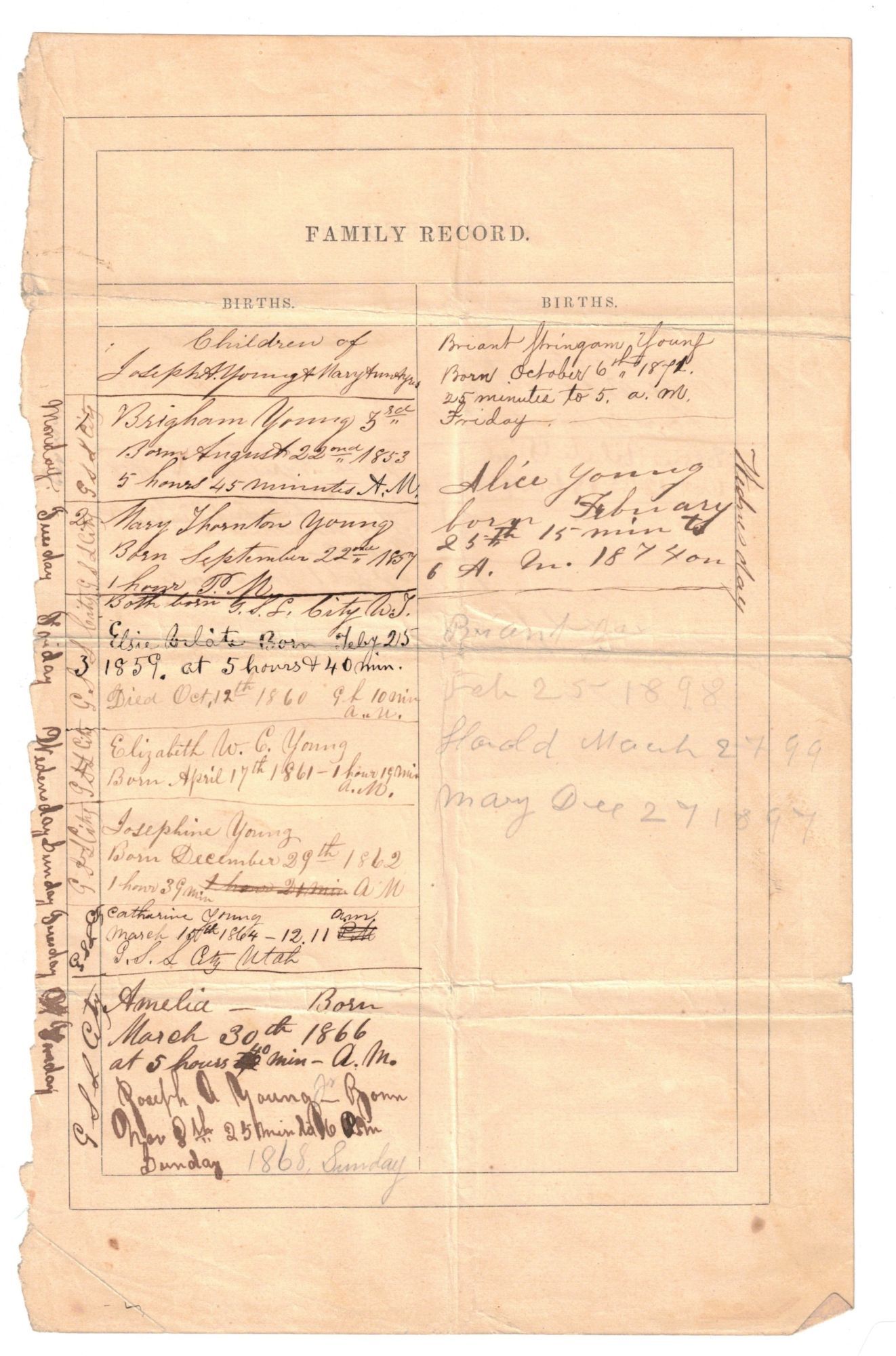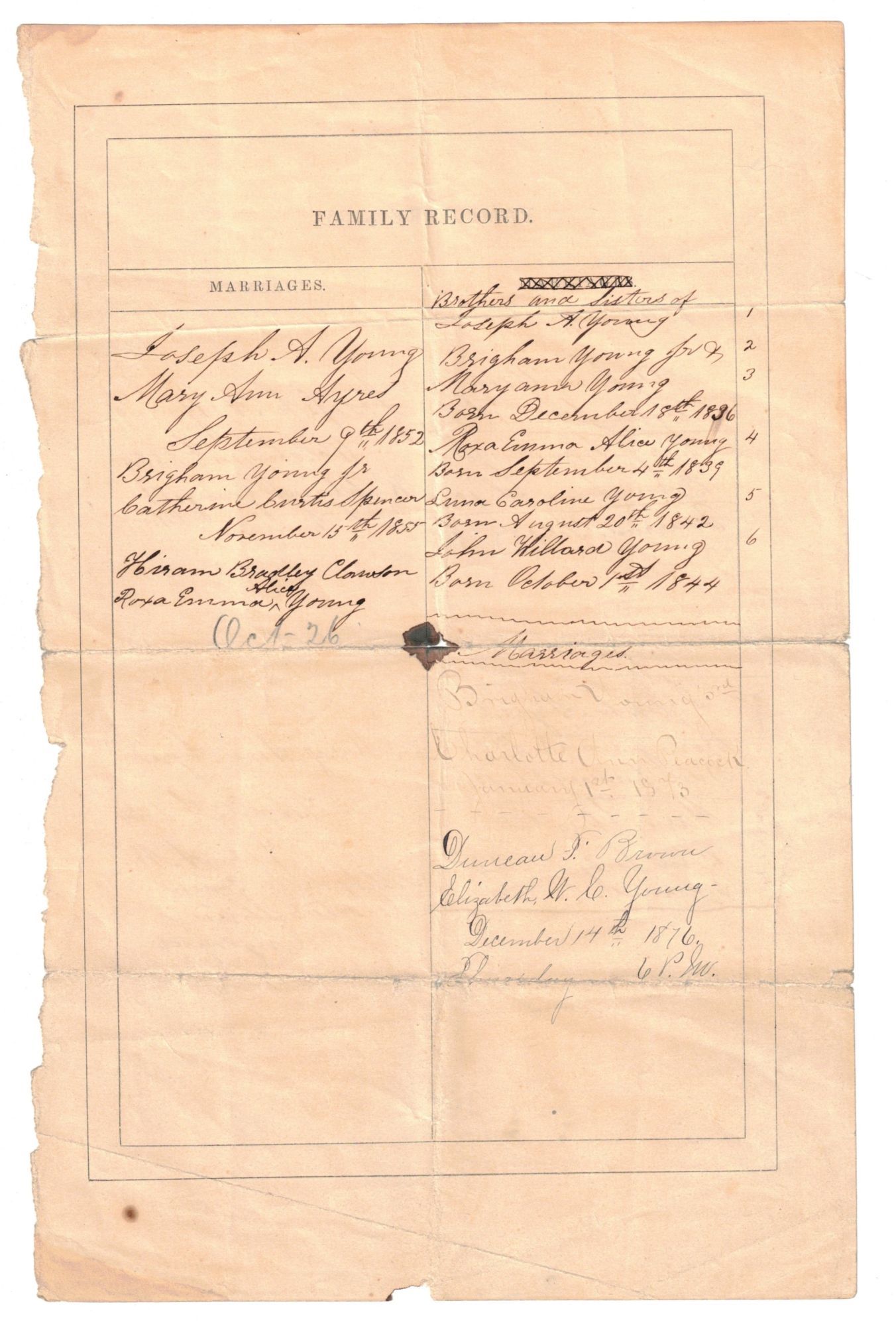 Ephemera. Four pages of genealogy on two loose leaves [6 1/2 x 10 1/4"] which appear to have come from a family Bible. The pages are divided into columns with the following headings: Births; Deaths; Marriages. One page lists the births of Joseph A. Young's parents (Brigham Young and Mary Ann Angell). On the reverse, the marriages of Joseph A. Young and his family members are listed. The second page lists the children of Joseph A. Young and Mary Ann Ayres in the "Births" column. The days of the week, along with "G S L City," are listed next to their names and the dates of their births (often with the exact time listed as well). On the verso of this page, the "Deaths" of their children are listed (Mary Thornton Young, Elsie Vilate, Josephine Young, Alice Young, and others). Joseph Angell Young (1834-1875) was Brigham Young's eldest son. He was born October 14, 1834 in Kirtland, Ohio. He came to Utah in an early day and actively participated in the affairs of the new settlement as a frontiersman. He also played an important role in emigration affairs, and he is known for enduring bitter storms and biting frosts during one of the harshest winters in order to successfully rescue the belated hand-cart companies of that season. In addition, he built and was the first superintendent of the Ogden-Salt Lake line (the old Utah Central), and was among the promoters of the Utah Southern. In 1872, Young was appointed to preside over the Sevier district of the Church, spanning from Gunnison to Kanab. Two years later, the settlements on the Sevier were organized as the Sevier Stake of Zion, and Elder Young was appointed to preside over this Stake. He held this position until his death, taking a significantly active part that tended to build up and strengthen the new settlements, as well as introducing the United Order to the Saints on the Sevier. In Latter-day Saint Biographical Encyclopedia Volume I, Andrew Jenson cites a passage published by Deseret News following Young's death: "Elder Young was esteemed for his many estimable qualities of heart as well as head. He was a man of naturally keen intelligence, his mental qualities even reaching what might be termed brilliancy in some directions, while his generosity was proverbial, especially among the working classes, all who were ever in his employ holding him in esteem for his universally kind and fair treatment." Andrew Jenson also points out, that "On account of the persecutions of the 'Mormon' people, he [Joseph A. Young] was deprived of the advantage of an early education, but was a discriminating and passionate reader, and at the time of his death had, perhaps, the finest private library in the Territory."