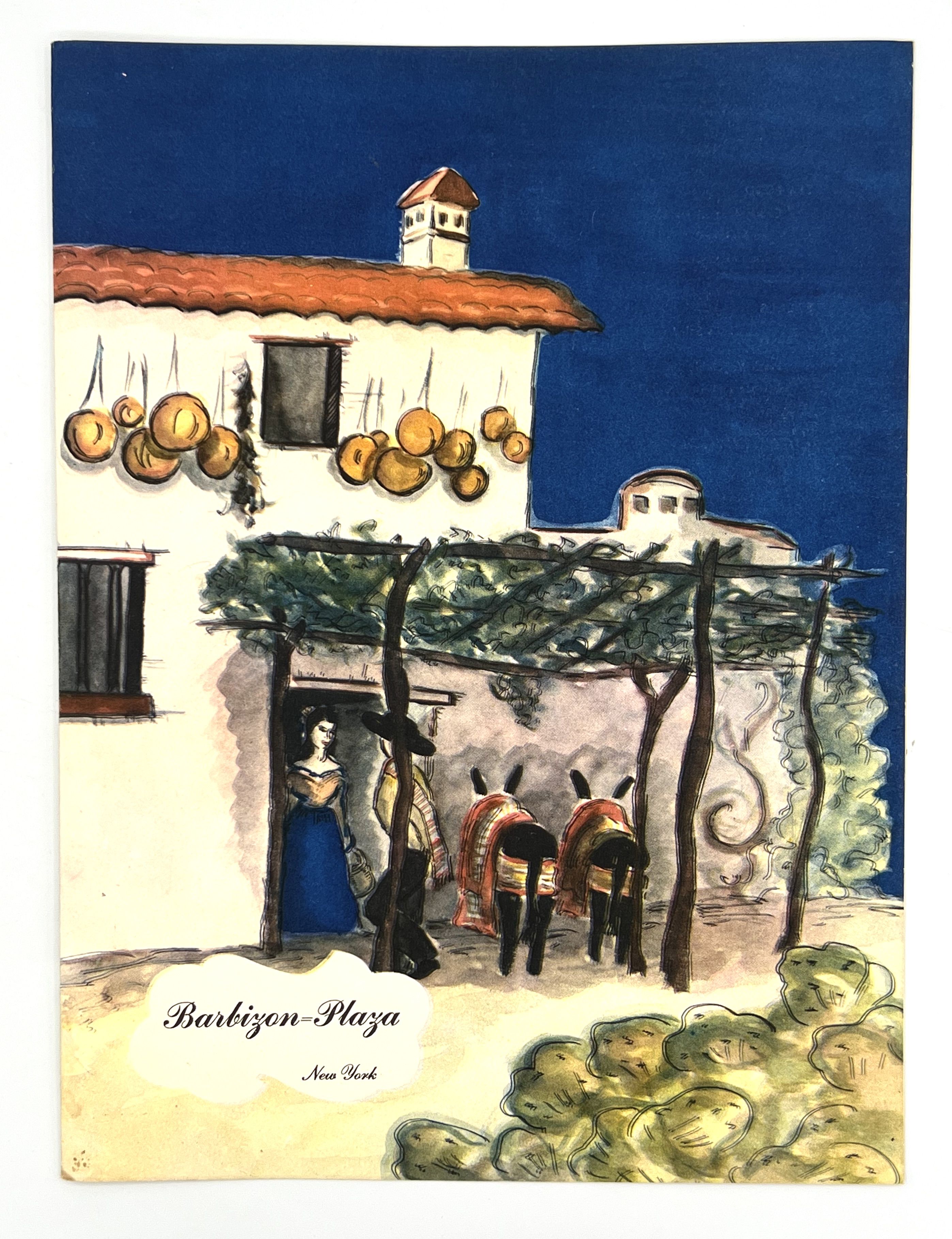 New York, 1948. Wraps. Color illustrated wraps. Very good. 30.5 x 23 cm. Thursday, October 21, 1948. From an original painting by Marilyn Newman, this menu depicts a scene of a Spanish Inn which is discussed on the back cover. Completed in 1930, the Barbizon-Plaza Hotel was originally built as the first residential hotel equipped as a music and arts center in the United States. This extensive menu features a "Theatre-Goers Dinner", Seafood, Salads, Sandwiches, Soups, and a large array of Entrees including: Stripped Bass, English Loin Lamb Chop, Calf's Liver and Bacon, and much more. The "Barbizon Cocktail" is highlighted for 75c, along with other cocktails, wines, and liquors. Small 2cm. stain on interior and back cover, front cover clean crisp.