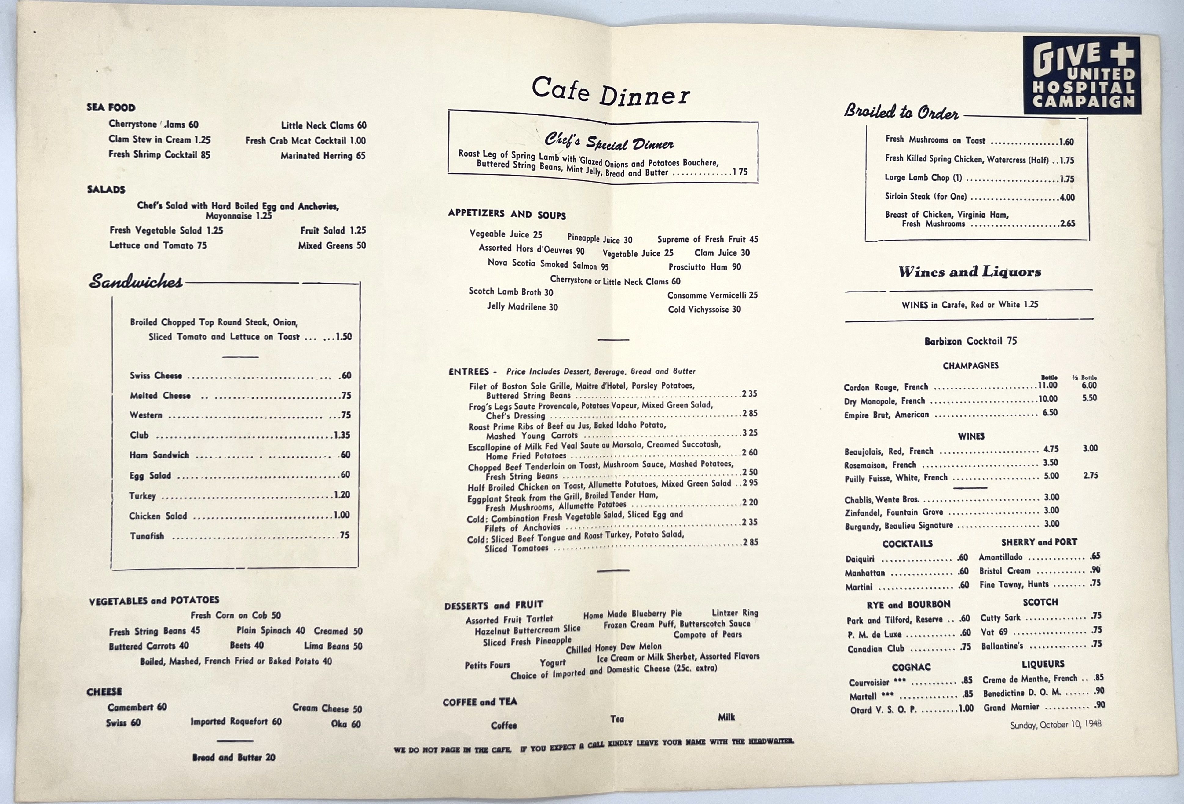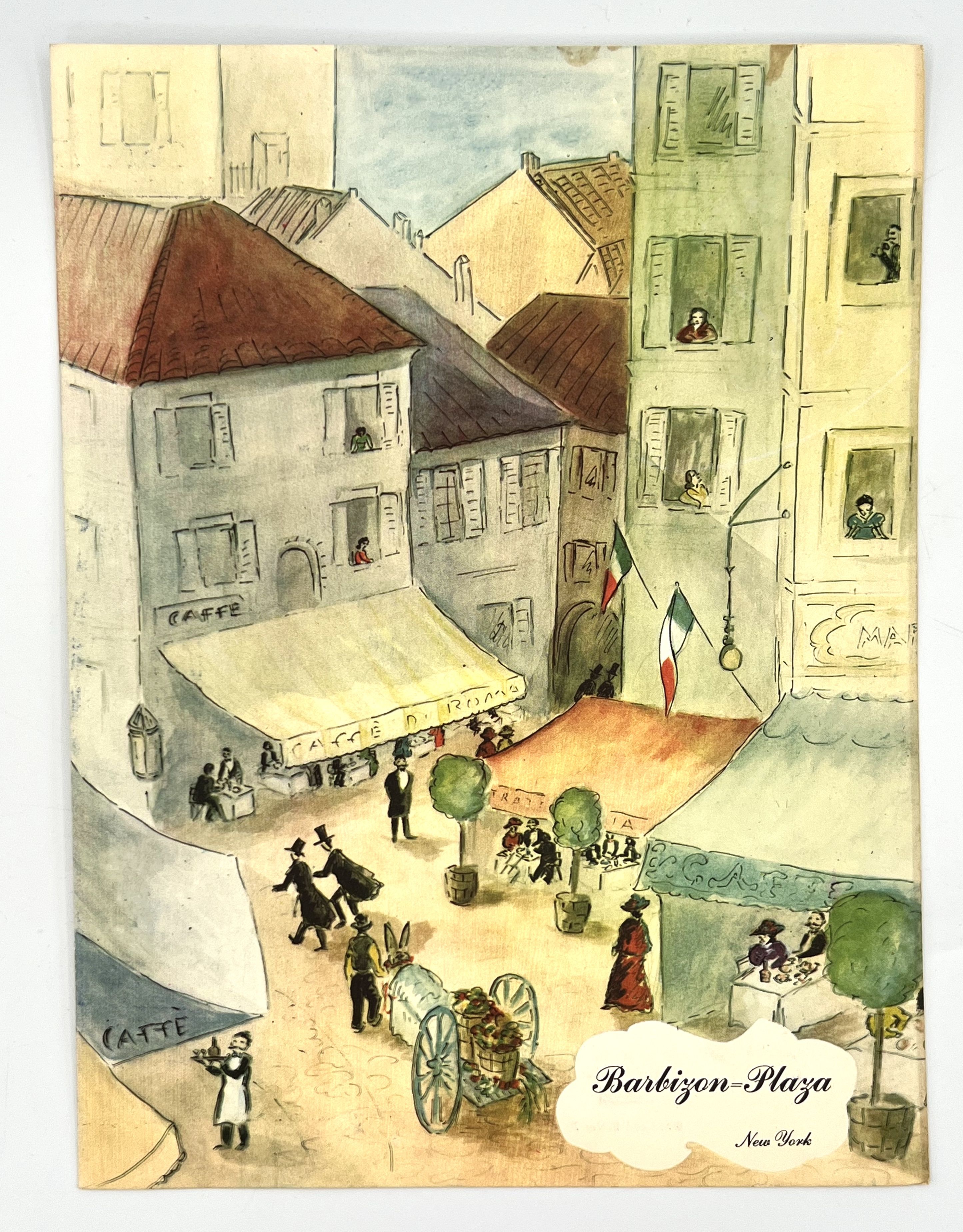 New York, 1948. Wraps. Color illustrated wraps. Very good. 30.5 x 23 cm. Sunday, October 10, 1948. From an original painting by Marilyn Newman, this menu depicts a scene from an Italian outdoor cafe, which is discussed on the back cover. Completed in 1930, the Barbizon-Plaza Hotel was originally built as the first residential hotel equipped as a music and arts center in the United States. This extensive menu features a "Chef's Special Dinner" - Roast Leg of Spring Lamb with Glazed Onion, along with Seafood, Salads, Sandwiches, Soups, and a large array of Entrees including: Filet of Boston Sole, Frog's Legs Sauté Provencale, Eggplant Steak from the Grill, and much more. The "Barbizon Cocktail" is highlighted for 75c, along with other cocktails, wines, and liquors. Interior with light toning at edges, covers clean and crisp.