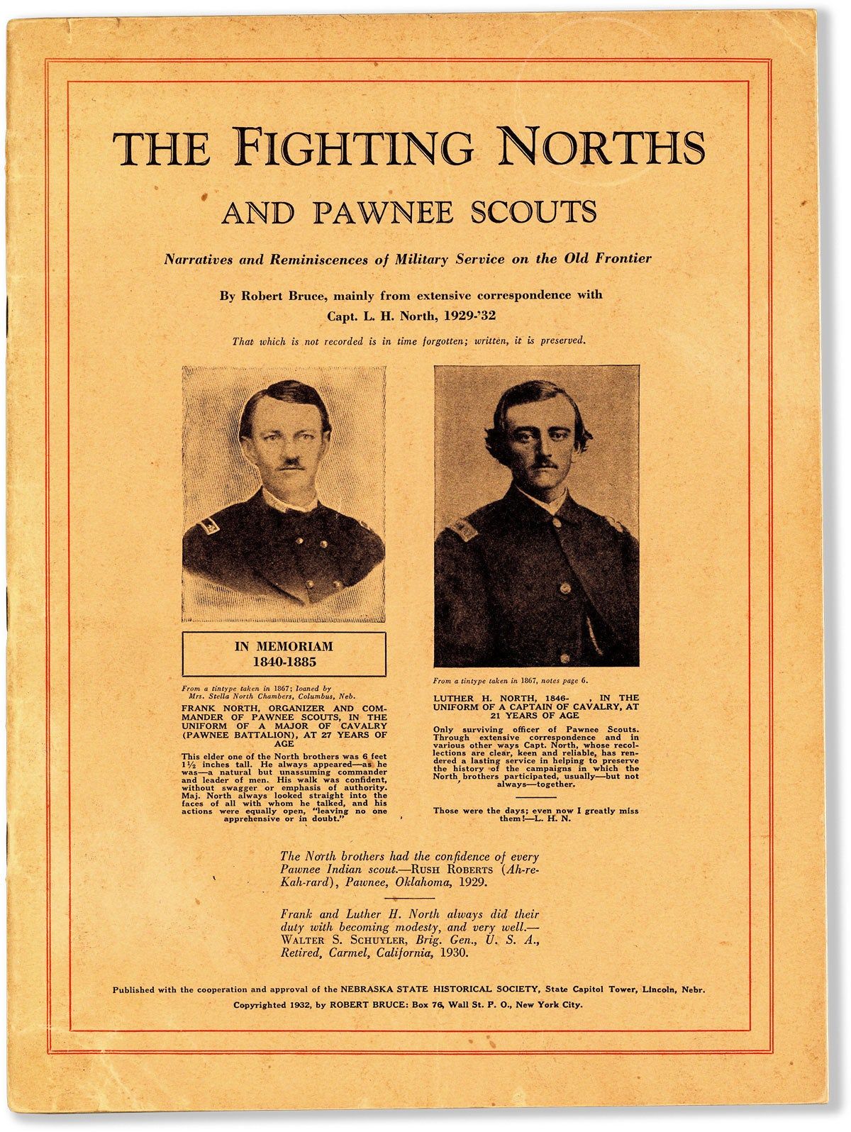 Lincoln, Nebraska: Brooklyn Eagle Press, 1932. First Edition. Folio. 31cm. Publisher's illustrated buff card wraps. 72pp. Some minor creasing and marking to the covers, a small closed tear at the base of the rear spine hinge. A very good, strong copy. Internally clean. A lavishly illustrated history of the North brothers, Frank and Luther, and their military careers on the frontier and beyond.