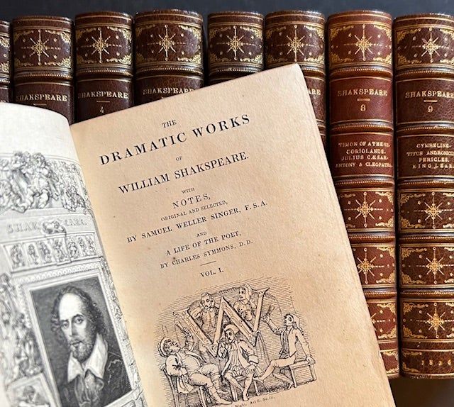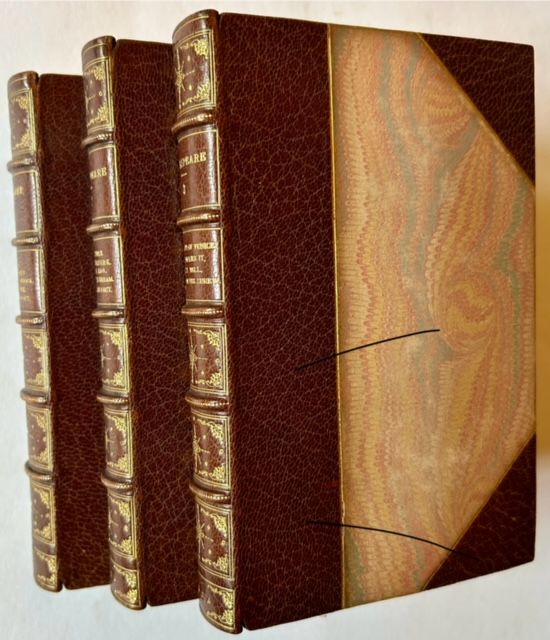 Chiswick (West London): Charles Whittingham, 1826. 3/4 leather. Very Good +. John Thompson ( with Stothard, Corbould, Harvey, etc.). A lovely example of this 1826 collection of Shakespeare's dramatic works, complete in 10 vols. and bound in a late 19th century 3/4 chocolate-brown morocco by the great Zaehnsdorf Bindery of London. Beautiful gilt-tooling and design within the compartments, 5 raised bands along each spine. Highly-decorative former owner bookplates (The McGinley family of Wilton, Connecticut) along each front pastedown and facing front free endpaper. Uniform 16mos, very handsome wood engravings throughout by pre-eminent British wood-engraver John Thompson (1785-1866). Continuing frm the title page: "With Notes Original and Selected, by Samuel Weller Singer, F.S.A. and A Life of the Poet, by Charles Symmons, D.D.". AND, on the preceding half-title, "With Sixty Engravings on Wood, by John Thompson; From Drawings by Stothard, Corbould, Harvey, Etc.").