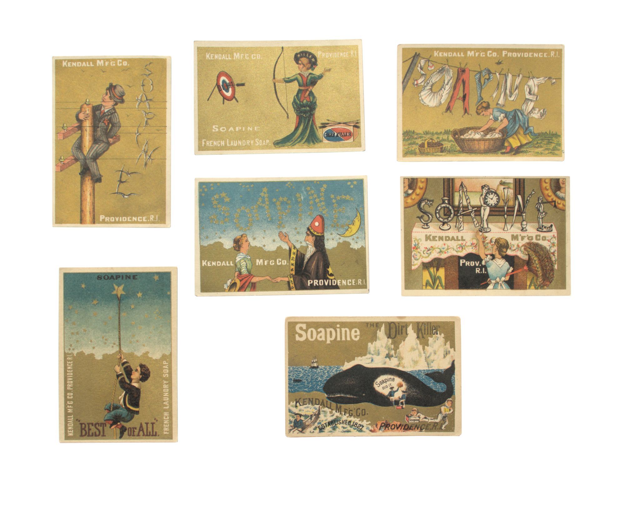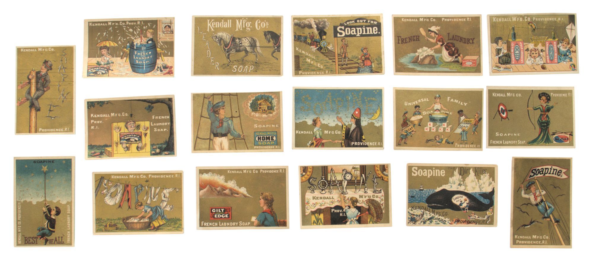 Providence, RI: Kendall Mfg. Co, 1880. Very Good. Providence, RI: Kendall Mfg. Co., ca. 1880-1884. Collection of seventeen (17) chromolithographed trade cards (7.5x11cm or the inverse), some printed on verso, others blank. Stock uniformly toned, a few with faint paper residue or tiny abrasions from having been previously mounted, else a Very Good, bright and sound collection.