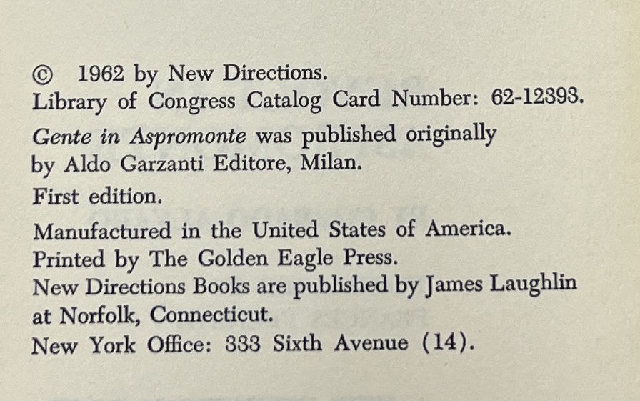 New York: New Directions, 1962. First Edition. Hardcover. Near Fine/Near Fine. Translated by Frances Franaye. Near Fine in an about Near Fine jacket, unclipped ($3.00), faded at the spine, rubbed and with some creases at the edges. Quarter black cloth with yellow-green paper on the boards, rubbed at the spine. Square and firmly bound, two small stains at the top edge, clean internally. Alvaro's novel of peasant life in Calabria and one man's sacrifices to raise the future prospects of his son.