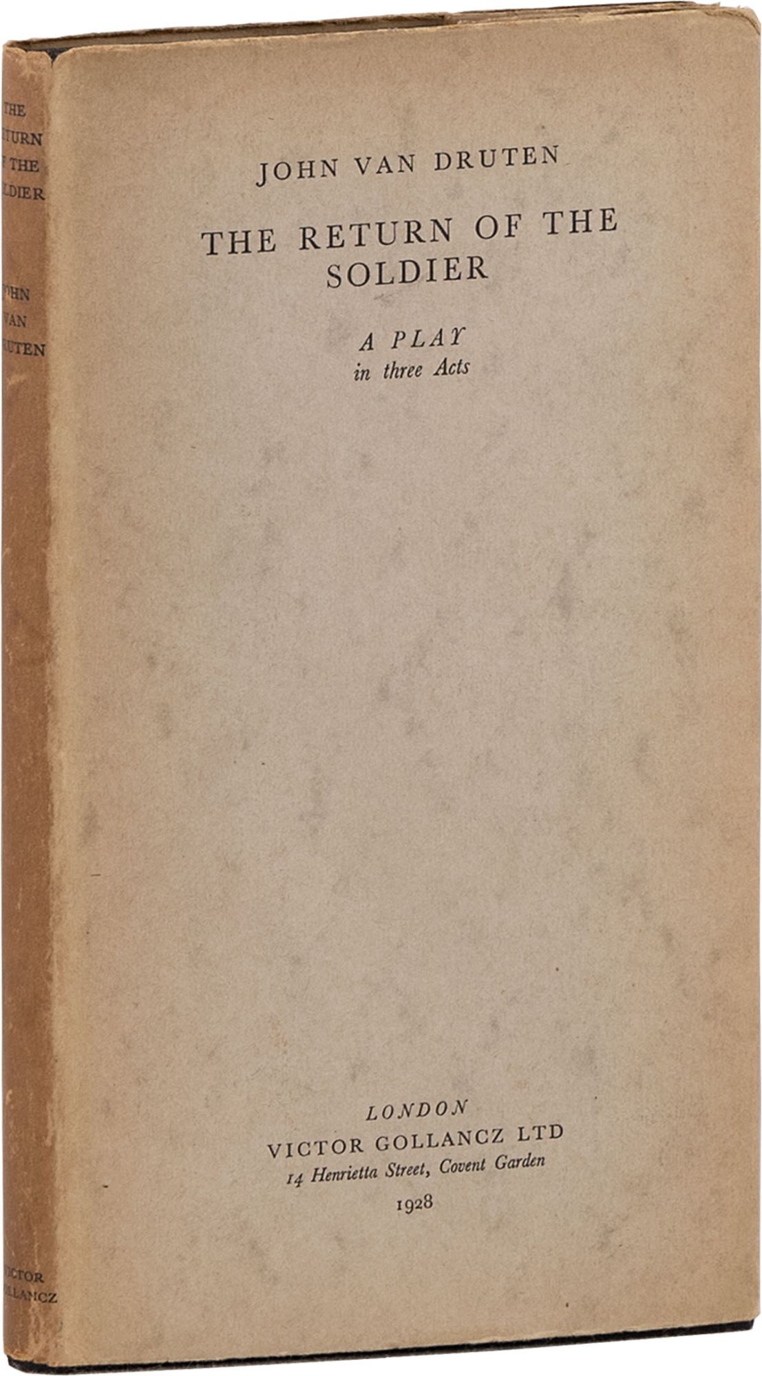 London: Victor Gollancz Ltd, 1928. First U.K. Edition. Small Octavo. 19cm. Publisher's original black cloth titled in black on a red background to spine. Dustjacket. 116pp. Bright and vibrant, in a clean, strong buff card dustjacket with some toning to the spine panel. A very good copy indeed. Internally clean, some offsetting to pastedowns and flyleaves. An emotive dramatic sketch, set in 1916, dealing with soldiers returning from war irrevocably changed, and the havoc that wreaks upon those they left behind, adapted from Rebecca West's novel it was something of a departure from Van Druten's rather brittle drawing room wit. Van Druten lived a turbulent life, dying in his mid-50's under undisclosed circumstances, and is probably best known as the author of "I am A Camera" in 1951, based on Isherwood's "Goodbye To Berlin" and which provided in part the basis for Kander & Ebb's "Cabaret." In a piece of rather creative defiance against queer relationships having no civil or legal grounding at the time, Van Druten left his ex-partner Carter Lodge the rights to his work, amongst other benefits, thus ensuring that he could profit from the continued success of "Cabaret.