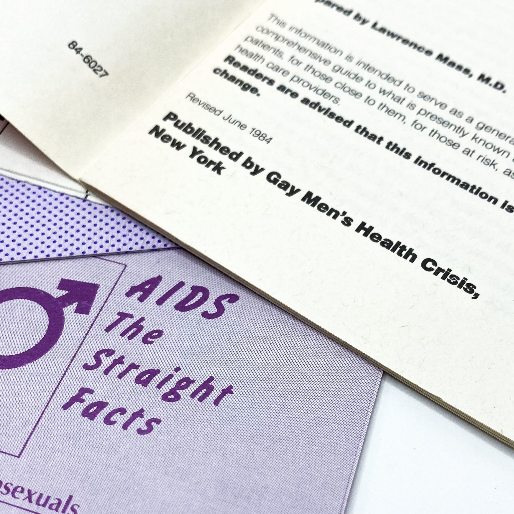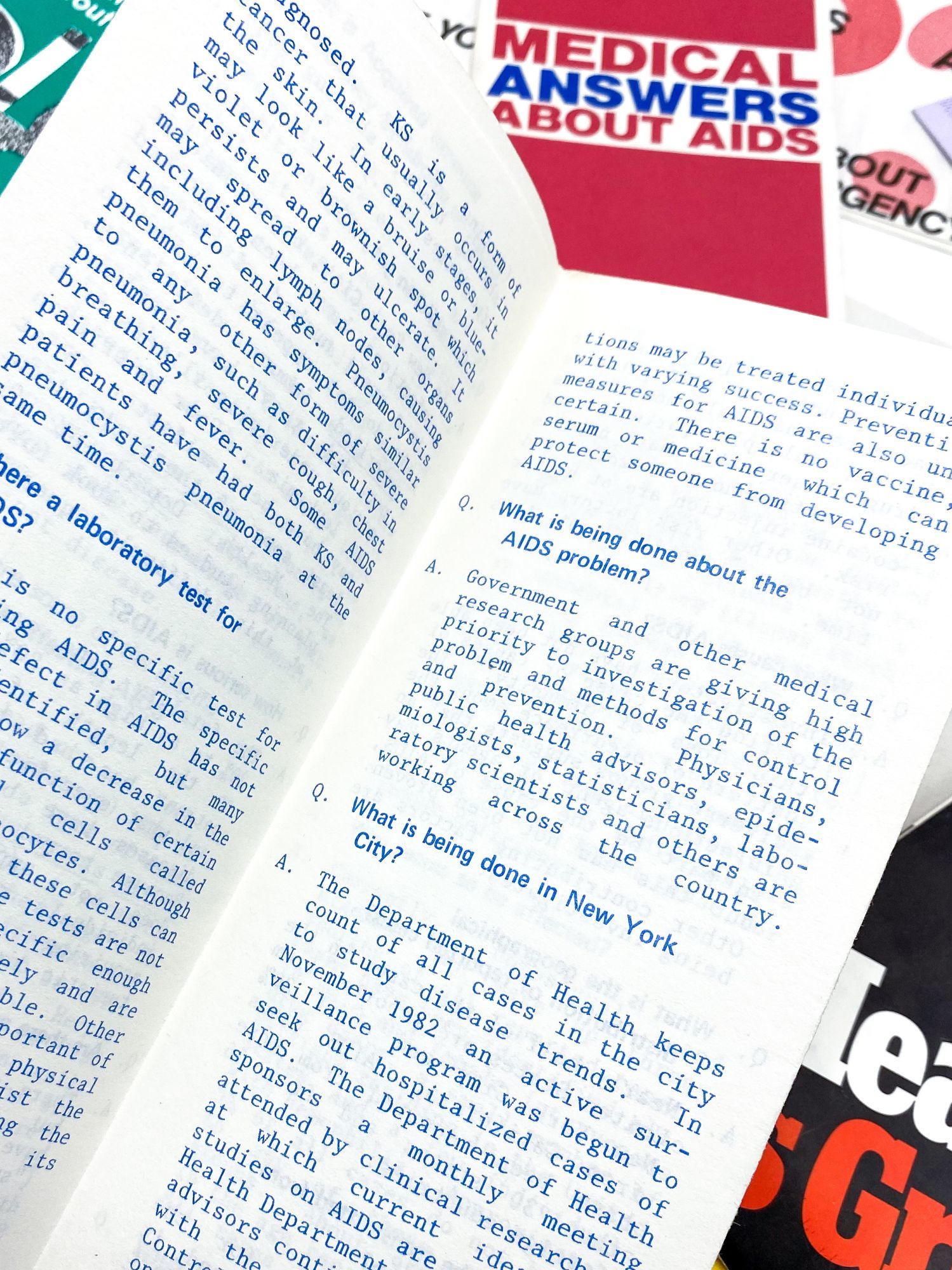 Comprised of 20 separate publications, the collection includes: eight brochures produced by GHMC, including their first "Healthy Sex is Great Sex" guideline, a Roy Liechtenstein-inspired pamphlet (designed by Robert Passantino), guidelines on how to respond when a loved one becomes ill, and several brochures providing legal and medical information; a 38-page booklet on venereal disease prevention published in 1983 by Gay Men's Health Project (whose single section on "gay cancer" clearly reflects the fear and confusion prevalent in the epidemic's early days); eight pamphlets imparting guidance on antibody tests, social services, and medical assistance issued by the New York State Health Department's AIDS Institute (several in English and Spanish); and a brochure on information resources by the New York Public Library.