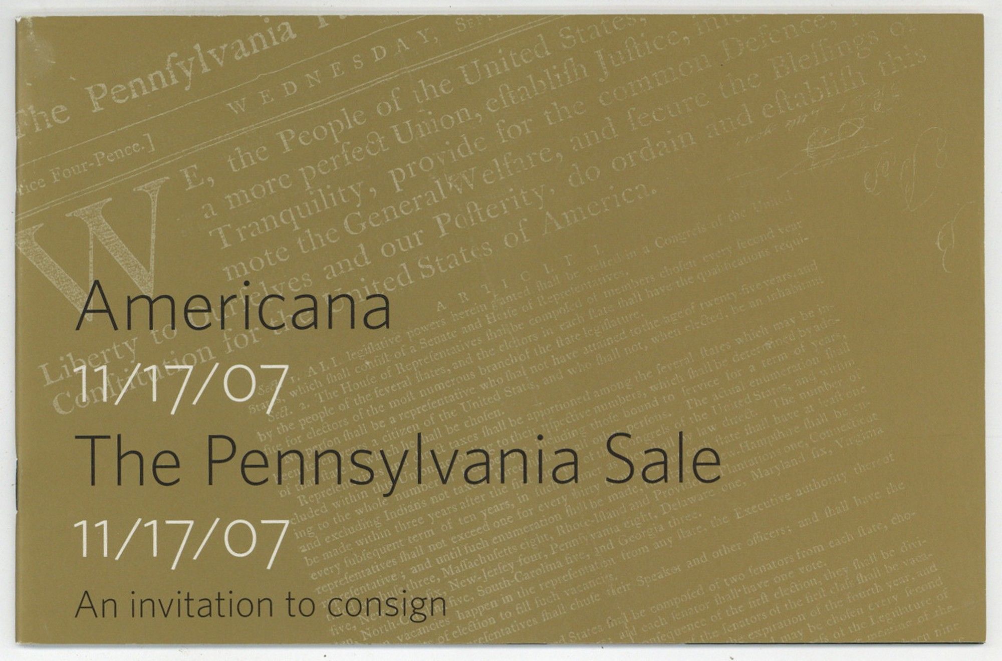 (Philadelphia): Freeman's, 2007. Softcover. Fine. Auction announcement. Oblong octavo. [20]pp. Illustrated in color. Fine in stapled wrappers with a tiny bit of wear. An invitation to consign in Freeman's annual Pennsylvania Sale; the pamphlet is nicely illustrated with a variety of fine Americana and their prices realized at previous auctions.