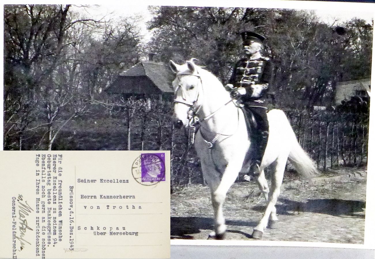 He acknowledges his birthday greeting from von Trotha on his 94th birthday (1849--1945). Dated December 16, 1943 (his birthday was on December 6). As a Feldmarshall in World War I he commanded Army Group Mackensen), after the Armistice, the Allies had him interned in Serba for one year. In 1933 Herman Goring made him a Pruessian state councellor. He often appeard in officila functions in his World War I uniform and Nazi leaders suspected him of disloyalty. On February 4, 1940 he wrote to Generaloberst Walter von Brauchitsch about his return to private life but mentions the crimes done in Poland and notes the Army's honor should be maintained inspite of the hired subhumans and criminals. Both Hitler and Goebbels suspect him of disloyalty but avoided taking action. He died on November 8, 1945 at the age of 95, his life having spanned the Kingdom of Prussia, the German Empire, the Weimar Republic, the Nazi regime and the postwar Allied occupation of Germany.