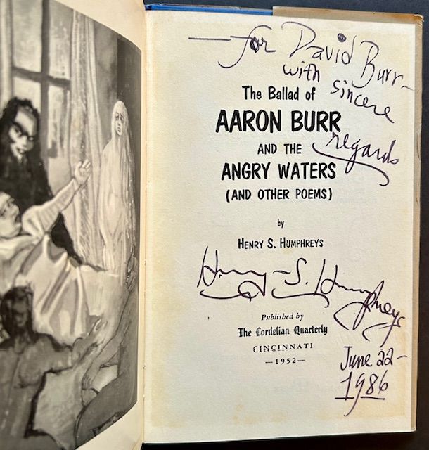 Cincinnati: The Cordelian Quarterly, 1952. Cloth. Very Good +/Very Good. INSCRIBED BY THE AUTHOR HENRY S. HUMPHREYS on the title page. A solid copy to boot of the uncommon 1952 1st edition. #77 OF 200 COPIES ISSUED, which is stated as such and additionally signed by Henry Humphries on the limiation page. olid and VG+ (light spotting to the panels) in a bright, VG dustjacket, with very light staining along the rear panel. Octavo, 30 pgs.