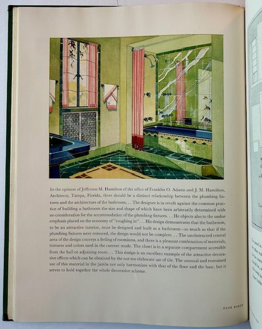 Standard Sanitary Manufacturing Company, 1931. Cloth. Very Good +. The uncommon 1931 1st (and almost certainly only) edition of this competition in bathroom design, sponsored by the Standard Sanitary Manufacturing Company. Solid and VG+ in its duotone cloth, with Deco silver title label affixed to the front panel. Mild streaking to the panels, the interior clean as could be, with the 20 lovely color plates along the versos bright and vibrant. Tall quarto, an elegant look at early '30s interior design (even --or perhaps especially-- in bathrooms).
