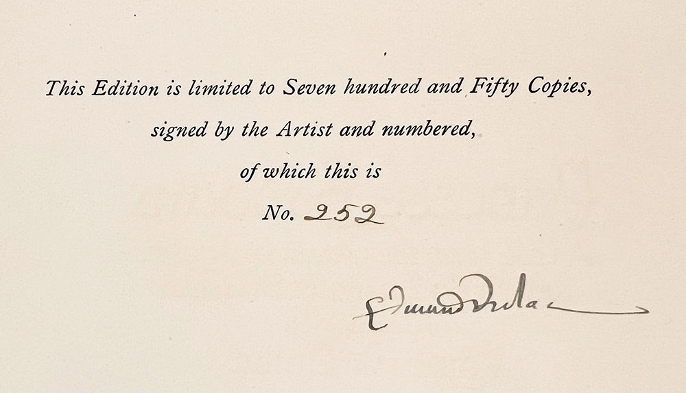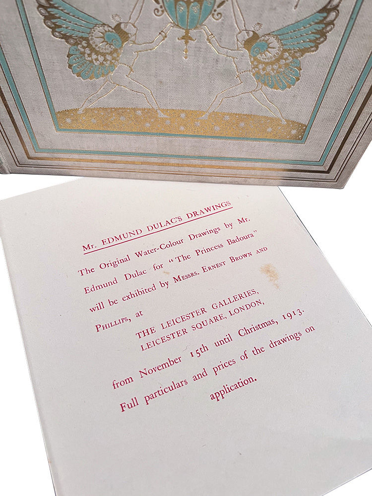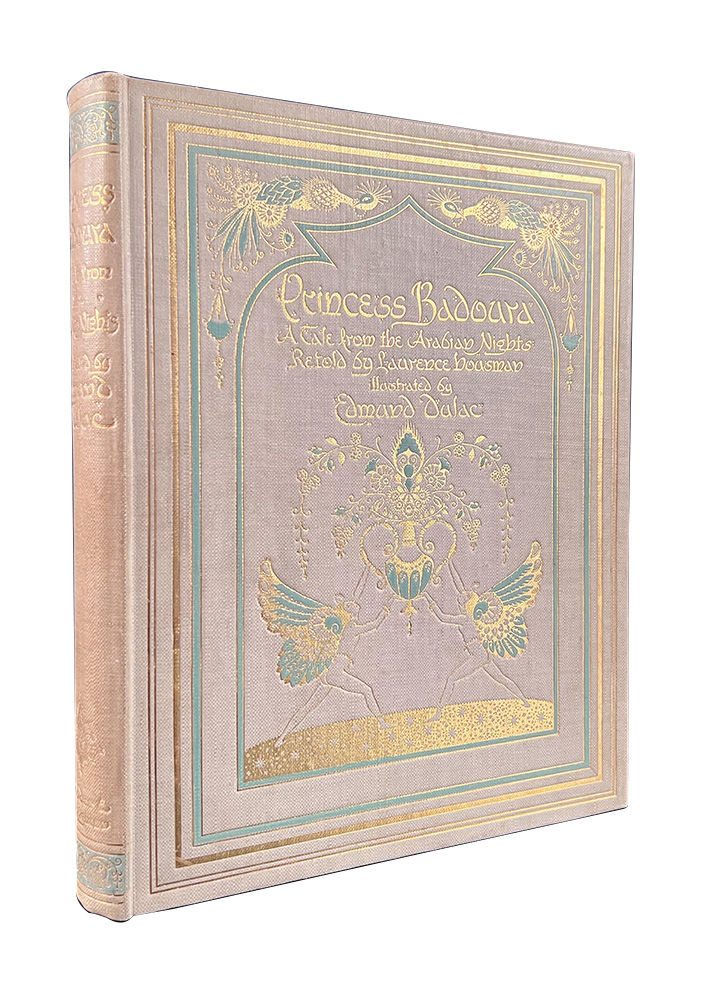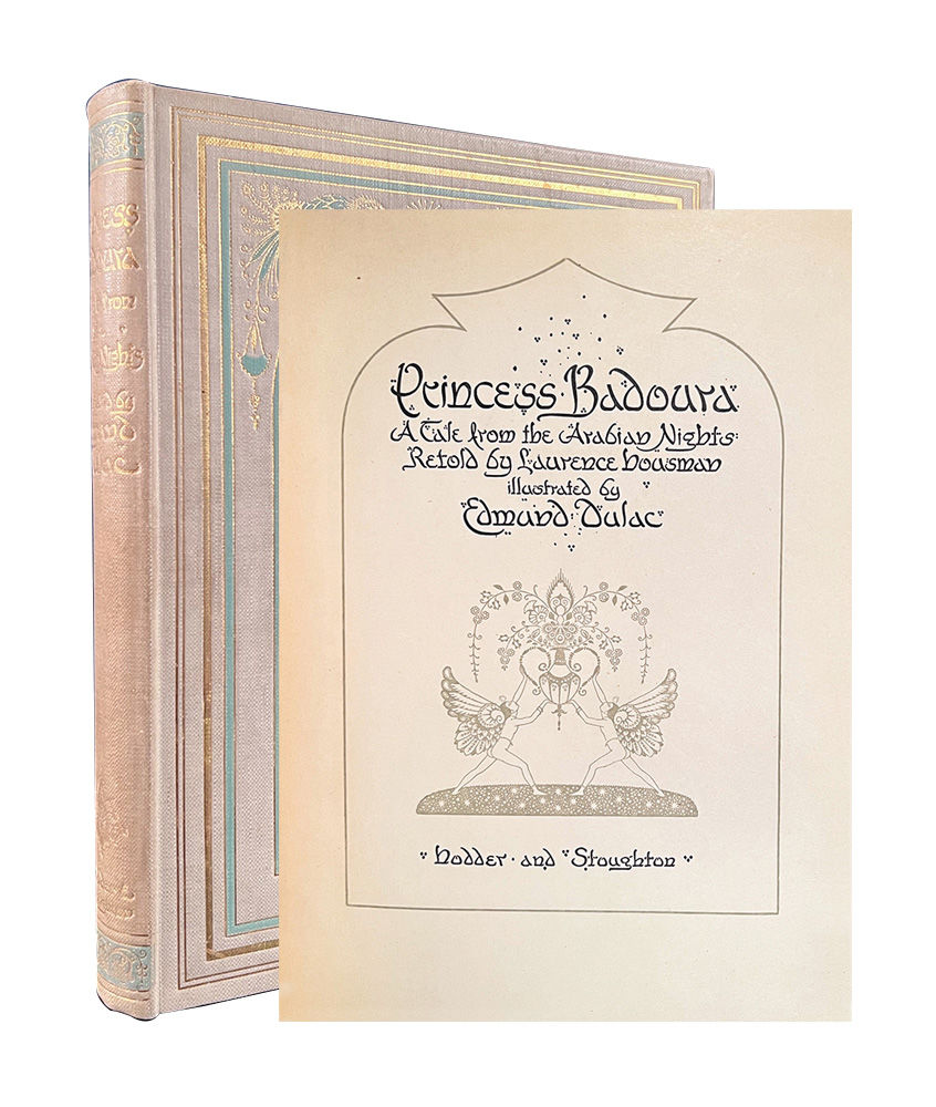 London: Hodder and Stoughton, 1913. Edition de luxe. Near Fine. No. 252 of 750 signed by Edmund Dulac. Large quarto (11 3/16 x 8 7/8 inches; 287 x 226 mm.). [viii], 113, [1, printer’s imprint], [2, blank] pp. Ten mounted color plates (including frontispiece), with tissue guards printed at top with the design from the title-page and descriptive letterpress in light olive ink. Title within fanciful line border and with design of two winged figures holding high an urn of flowers in light olive ink. Text within similar line border in light olive ink. With the original Leicester Galleries 1913 exhibition advertisement sheet laid in. Publisher's cream buckram pictorially stamped in pale green and gilt (with design from title-page embellished by two peacocks and additional lines) and lettered in gilt on front cover and decoratively stamped in pale green and gilt and lettered in gilt on spine. Top edge gilt, others uncut. Spine very slightly darkened, otherwise a near fine copy.